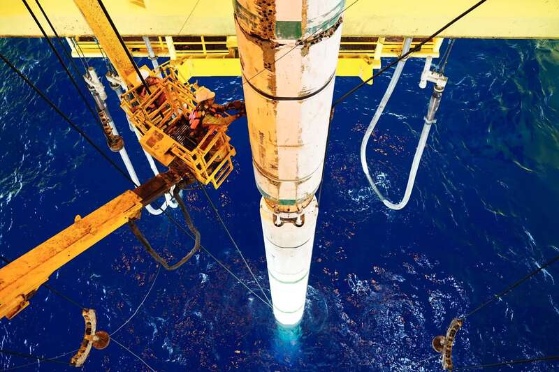 现场作业人员将深水钻井管柱送入海底。摄影李建禄