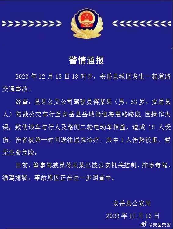 经查,县某公交公司驾驶员蒋某某(男,53岁,安岳县人)驾驶公交车行至安岳县岳城街道海慧路路段,因操作失误,致使该车与行人及路侧二轮电动车相撞,造成12人受伤,伤者被第一时间送往医院治疗,其中1人伤势较重,暂无生命危险。