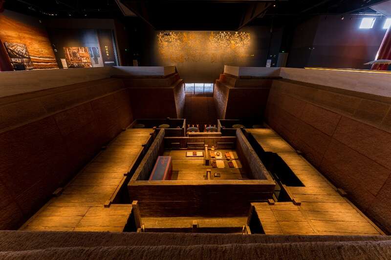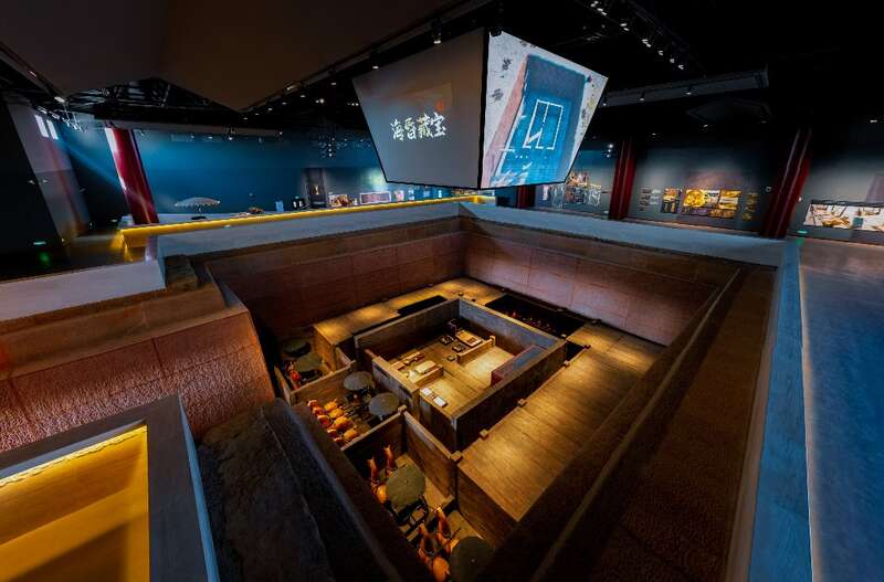 中青报·中青网记者看到,在这约400平方米的墓室里,有厨具库、乐器库、钱库、粮库、酒具库等区域,刘贺主棺位于中堂偏东的位置。墓坑上方有一个360度的悬吊荧幕,为游客动态介绍刘贺墓园的修建过程及汉代列侯的丧葬礼仪。