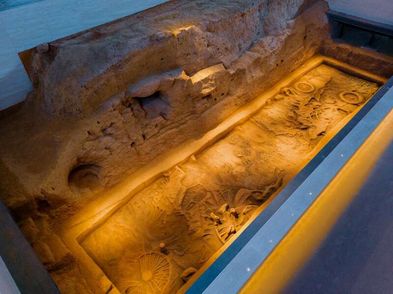 主墓旁侧,便是中国长江以南地区发现的唯一带有真车马陪葬坑的墓葬遗址——车马坑遗址。一辆复原的驷马安车模型立于坑旁,展现着汉代王侯出行的赫赫威仪。