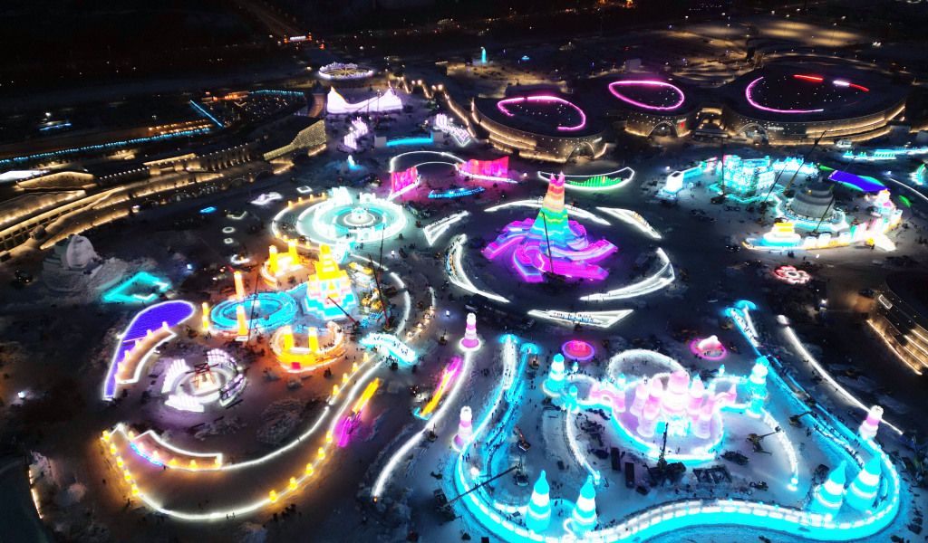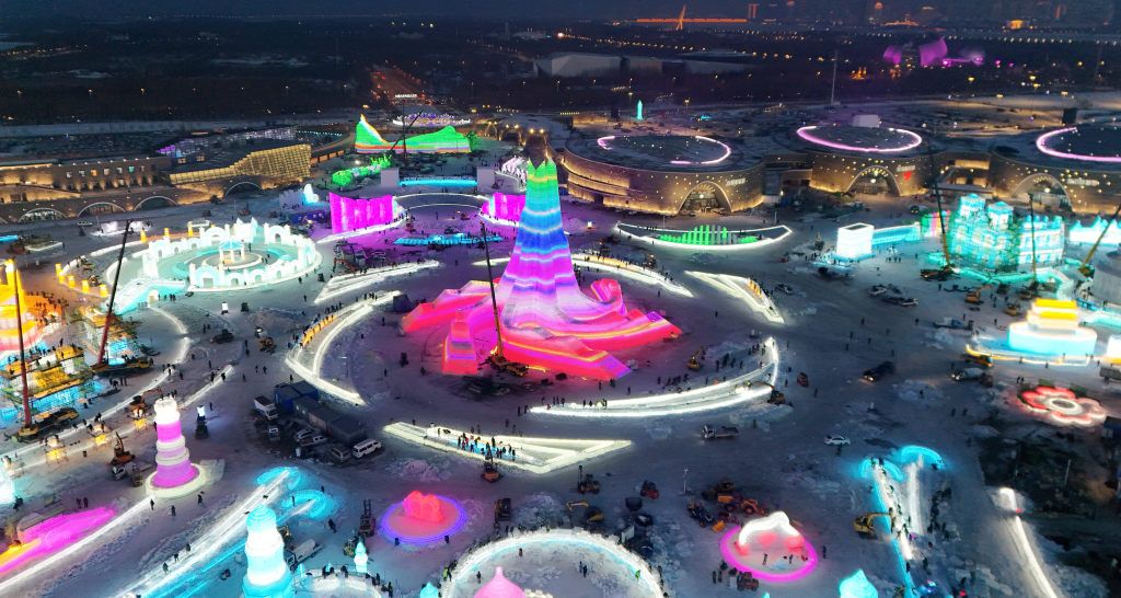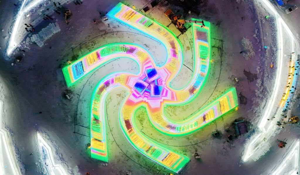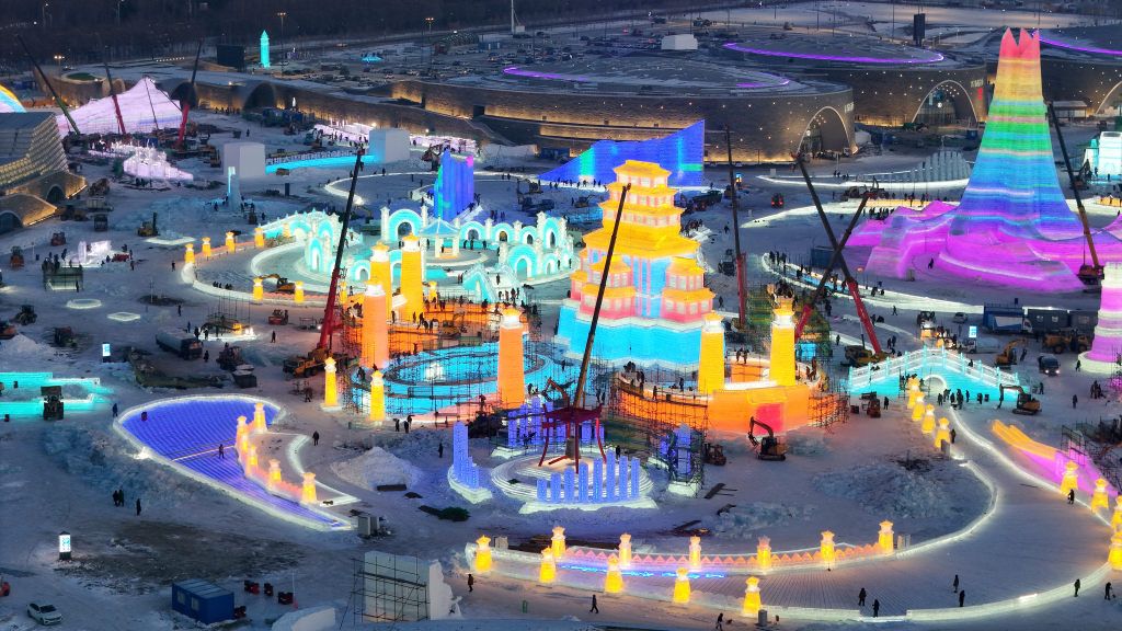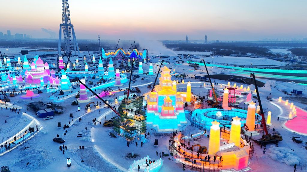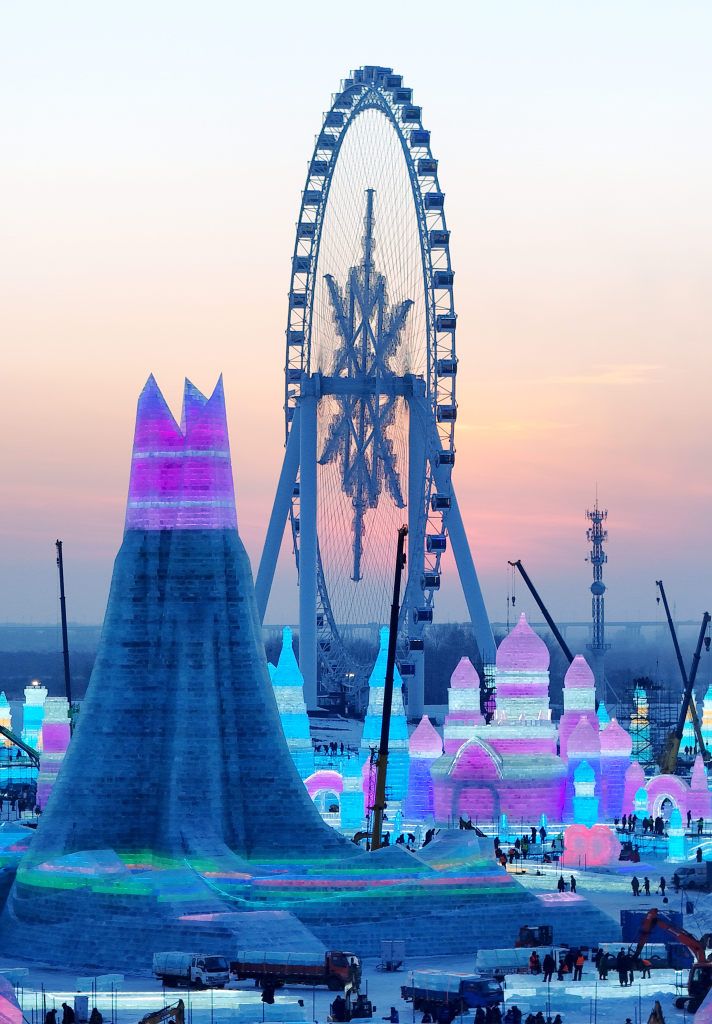 2023年12月14日,第二十五届哈尔滨冰雪大世界施工已近尾声,多数冰建已告完工,夜幕降临,这里成为一座冰影璀璨的琉璃世界。