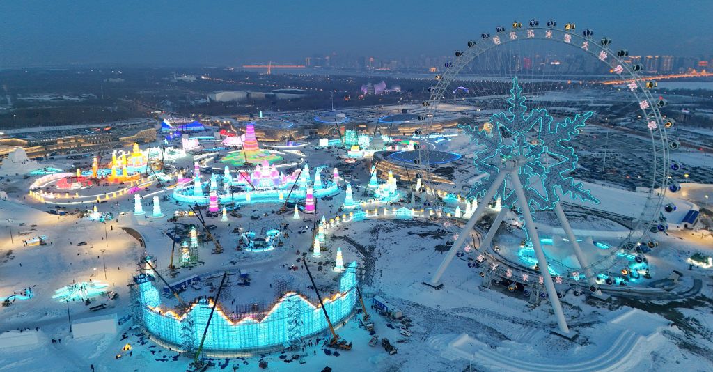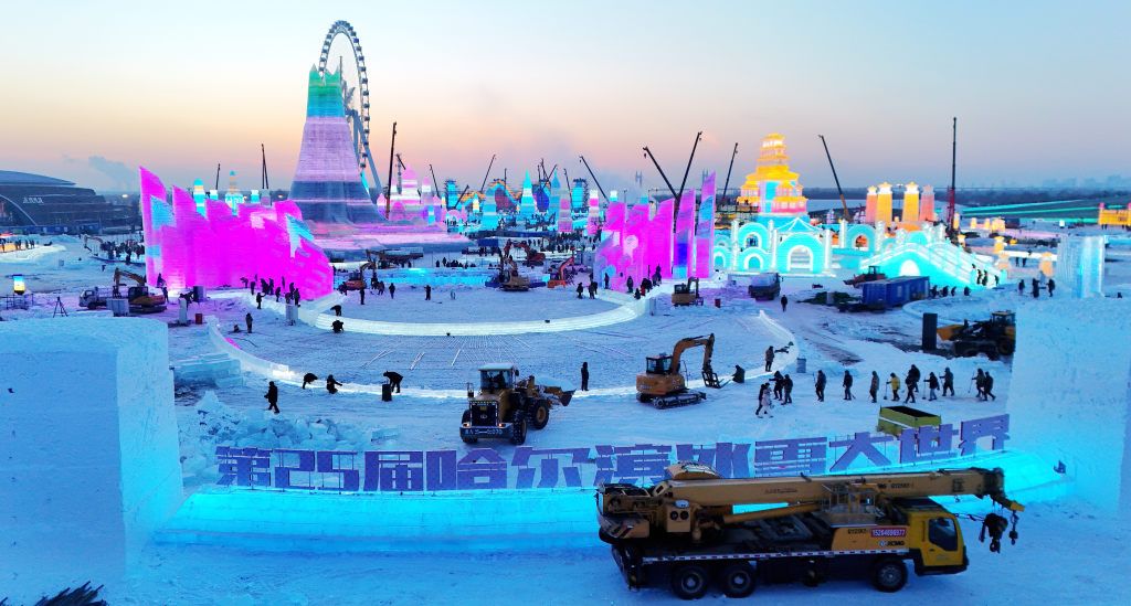 2023年12月14日,哈尔滨冰雪大世界正在忙碌建的设中,整个园区初露端倪,高43米的主塔“冰雪之冠”、超级冰滑梯、雪花摩天轮等等美轮美奂的冰雪景观,都可以看到。
