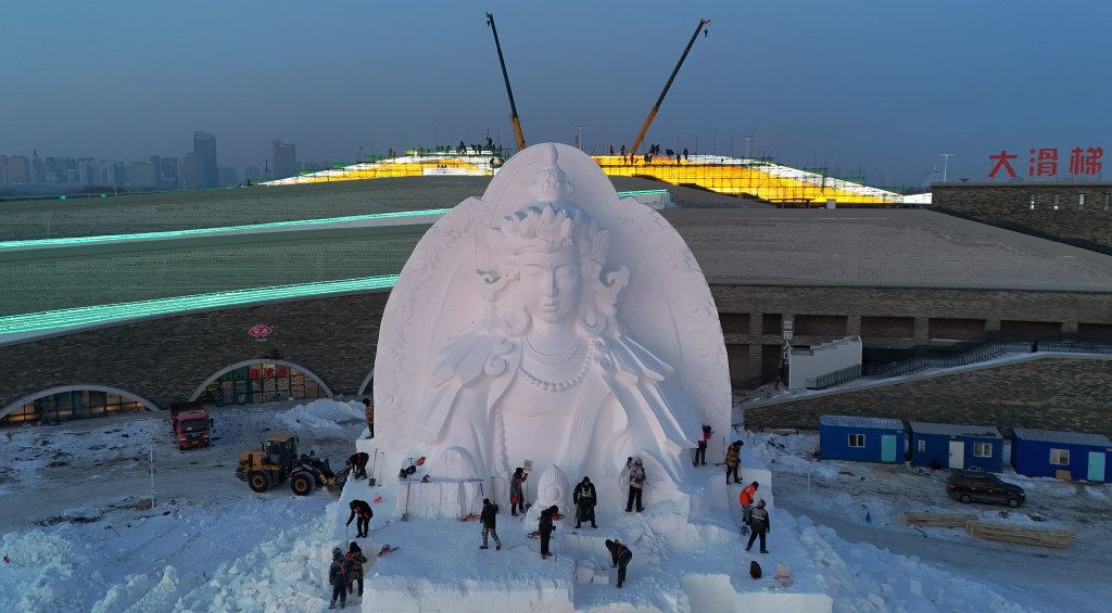 2023年12月14日,第二十五届哈尔滨冰雪大世界即将开园,坐落在园区东北角的一尊雪佛主体已经完工。