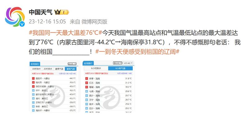 一到冬天便感受到祖国的辽阔!据@中国天气,今天我国气温最高站点和气温最低站点的最大温差达到了76℃(内蒙古图里河-44.2℃→海南保亭31.8℃)。