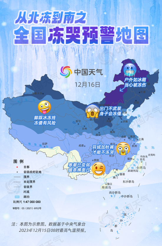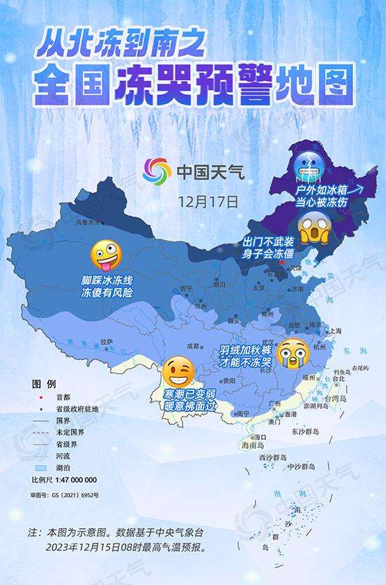 17日,吉林中东部的气温会降至此轮过程的最低点,加入“冻伤区”;而新疆北部、内蒙古以及东北中南部全天的气温仍然在-10℃以下,继续待在“冻僵区”;“冻傻区”进一步扩大,最高气温0℃线南压至合肥、南京一带,江淮部分地区的朋友也要“踩”上冰冻线了。而在华南一带,最高气温不足10℃的区域也将继续南压,像南宁17日的最高气温只有10℃左右,妥妥“冻哭”没商量。
