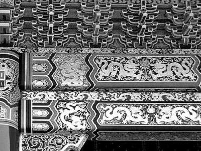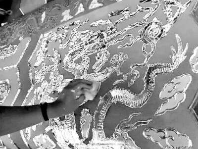 龙为我国古人想象中灵兽及帝王的化身,其造型复杂,明代医学家李时珍在《本草纲目》中形容龙的造型为“头似驼,角似鹿,眼似兔,耳似牛,项似蛇,腹似蜃,鳞似鲤,爪似鹰,掌似虎”。古人对龙的上述特征描述,在太和殿藻井中体现得淋漓尽致,尤其是位于藻井顶部正中的蟠龙,其盘踞于云雾中,张牙舞爪,口含宝珠(轩辕镜),气势磅礴,呼之欲出,栩栩如生。由此,繁杂的建筑造型得以展现出独特的艺术美感,再加上藻井浑金的色彩,最终烘托出皇家宫殿的壮丽与华美。