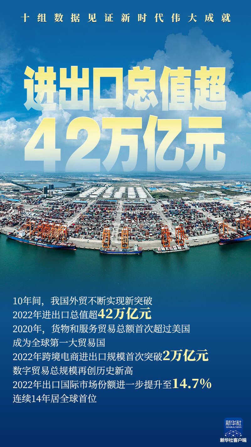 2013年至2022年10年间,一系列数据印证着我国外贸发展的坚实步伐:2020年,货物和服务贸易总额首次超过美国,成为全球第一大贸易国;我国跨境电商进出口规模从2018年的突破1万亿元增长到2022年的突破2万亿元,进入快速发展期;2022年出口国际市场份额进一步提升至14.7%,连续14年居全球首位……