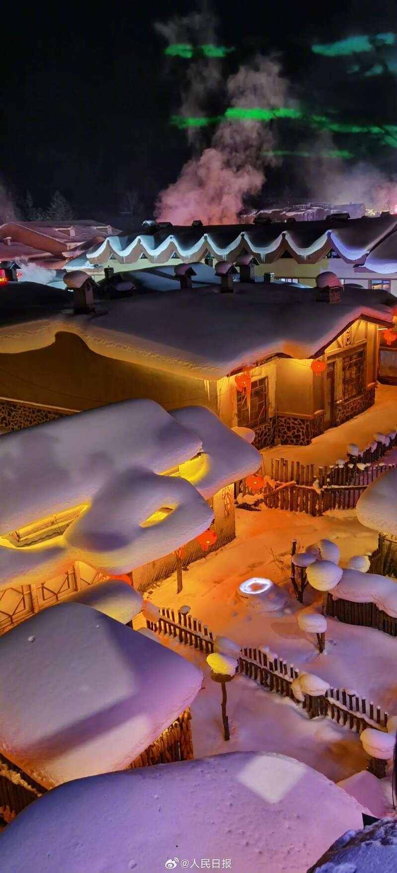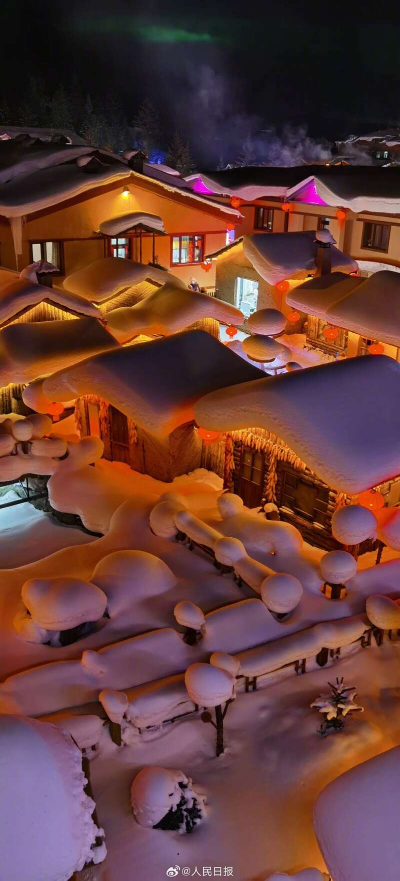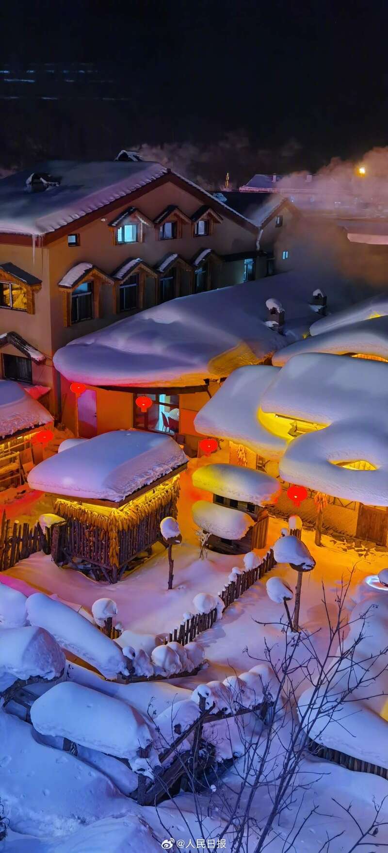 近日,黑龙江“中国雪乡”景区,夜晚灯光下的“蘑菇屋”景观浪漫唯美,仿若童话世界。