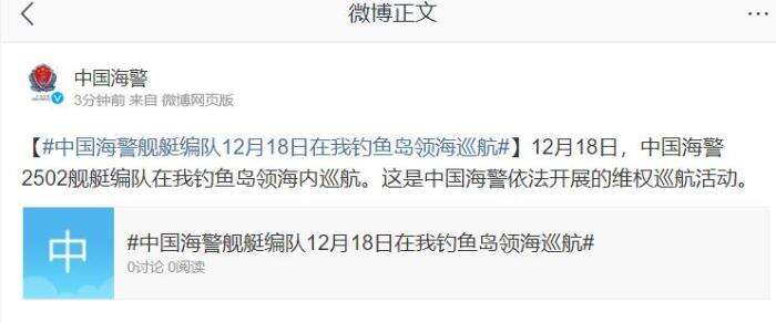 中新网12月18日电 据中国海警官方微博消息,12月18日,中国海警2502舰艇编队在我钓鱼岛领海内巡航。这是中国海警依法开展的维权巡航活动。