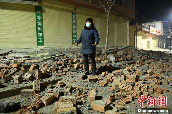 记者凌晨抵达震中附近的吹麻滩镇街道看到,仍有居民在路边生火取暖,他们有的披着被子,有的穿着厚棉袄。图为12月19日,记者在积石山县城了解居民受灾情况。