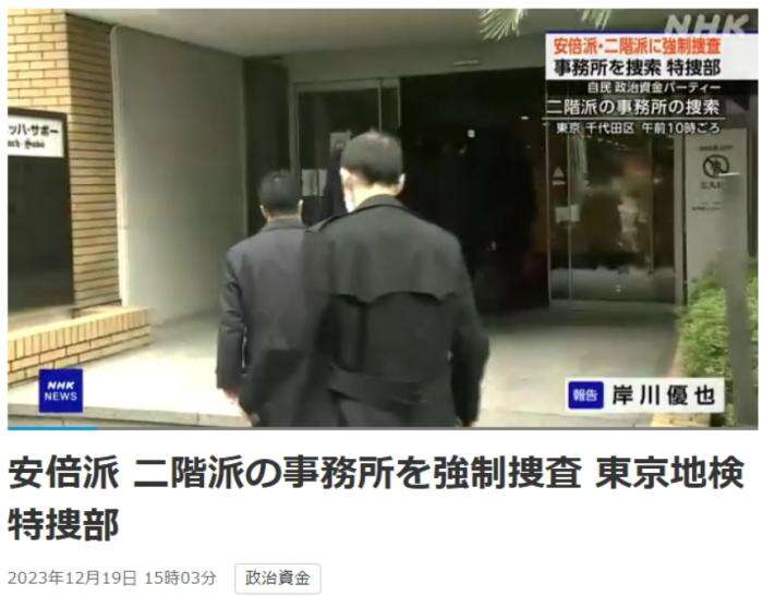 中新网12月19日电 据日本放送协会(NHK)报道,19日,日本东京地检特搜部以违反政治资金相关法规为由,对自民党安倍派(清和政策研究会)和二阶派(志帅会)的办公场所进行强制搜查。