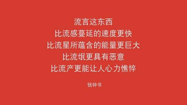 第9集片头引言:“流言这东西,比流感蔓延的速度更快,比流星所蕴含的能量更巨大,比流氓更具有恶意,比流产更能让人心力憔悴。”剧中标注的作者为钱锺书,网络公开信息也大多显示该句出自《围城》,但经过笔者检索,《围城》中并未出现该句,“流感”更是全书查无此词。截至发稿,笔者仍未从钱锺书先生的作品中找到该句,出处存疑,暂且按下不表。