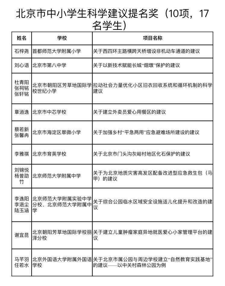 据了解,中小学生科学建议奖采用全开放的网络申报方式,北京市在读的中小学生均可按要求提交申报表和建议项目报告。在本次活动近四个月的申报期中,累计收到申报项目11815项,实现了申报项目的首次破万。其中科学建议2431项,建言献策9384项,万余学生参与活动。建议范围涉及智慧北京建设、乡村振兴发展、交通综合治理、民生保障建设、公共卫生与健康、中轴线文化遗产保护、首都文化建设、生态环境建设与保护、灾害预防与应急管理等社会热点问题。