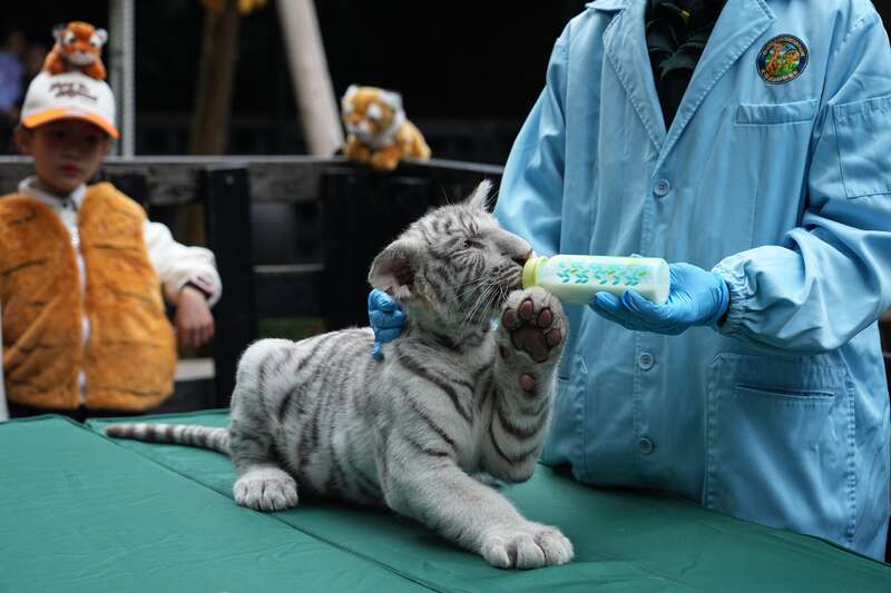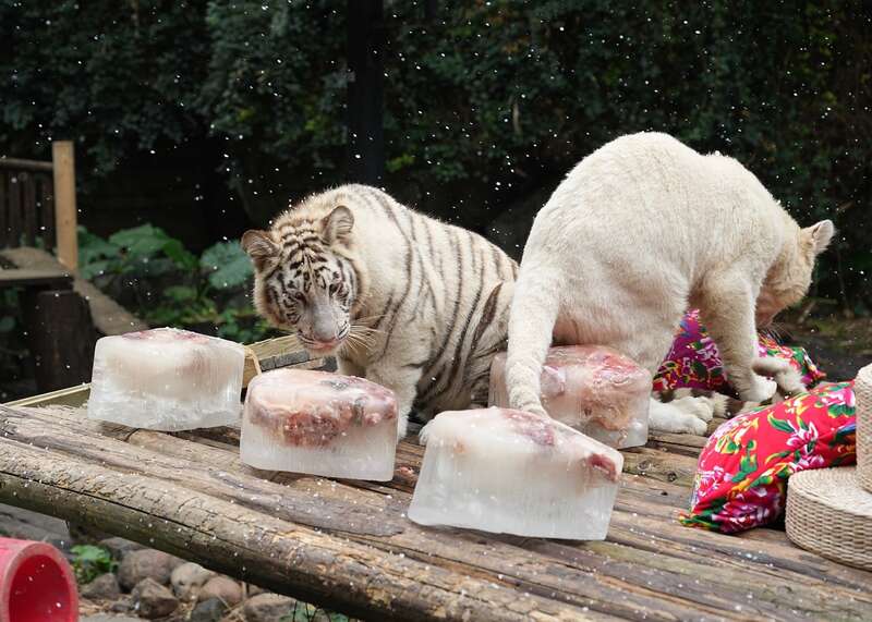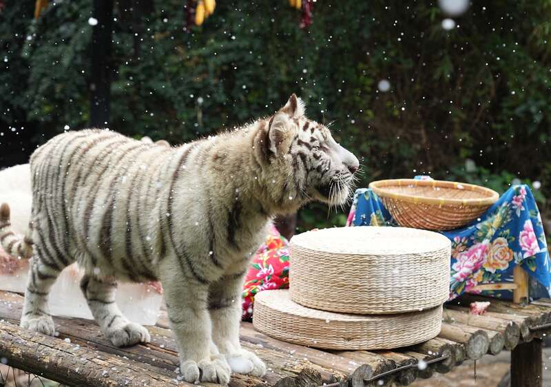 冬至临近,保育员准备了特制的“大饺子”,让小老虎提前尝鲜。恰逢长隆超级“大猫节”,园区在撒野乐园布置了充满冬日氛围感的限定“雪景”,小老虎们在“雪景”中快乐地打滚撒欢。