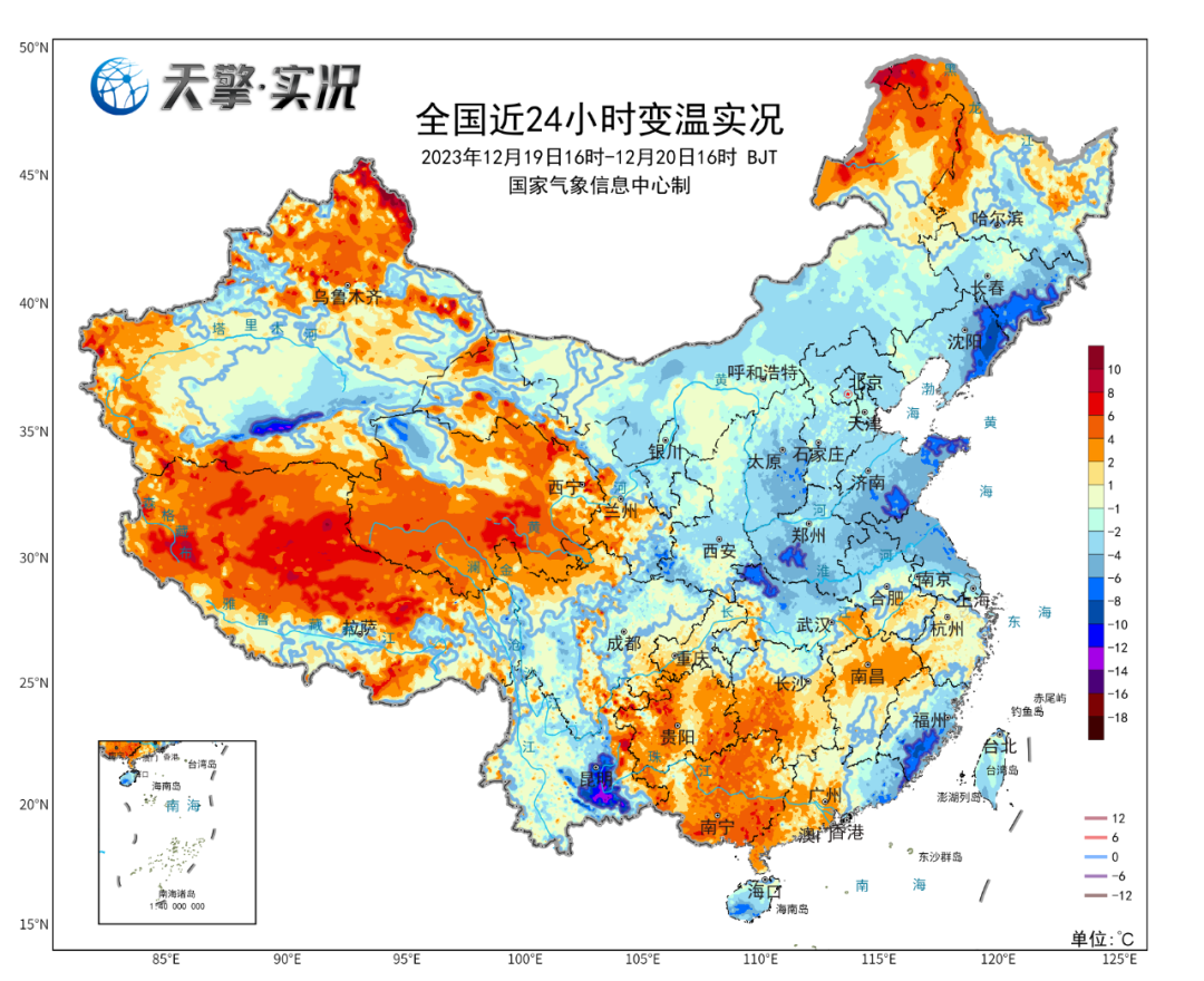 20日白天,降温的重心还是在北方。截至16时,9个北方省会级大城市最高气温创立冬来新低,分别是哈尔滨(-21℃)、长春(-19.3℃)、沈阳(-16.5℃)、呼和浩特(-17.2℃)、北京(-7.4℃)、天津(-8.2℃)、石家庄(-6.4℃)、银川 (-9.9℃)、济南(-5.9℃),可谓天寒地冻。