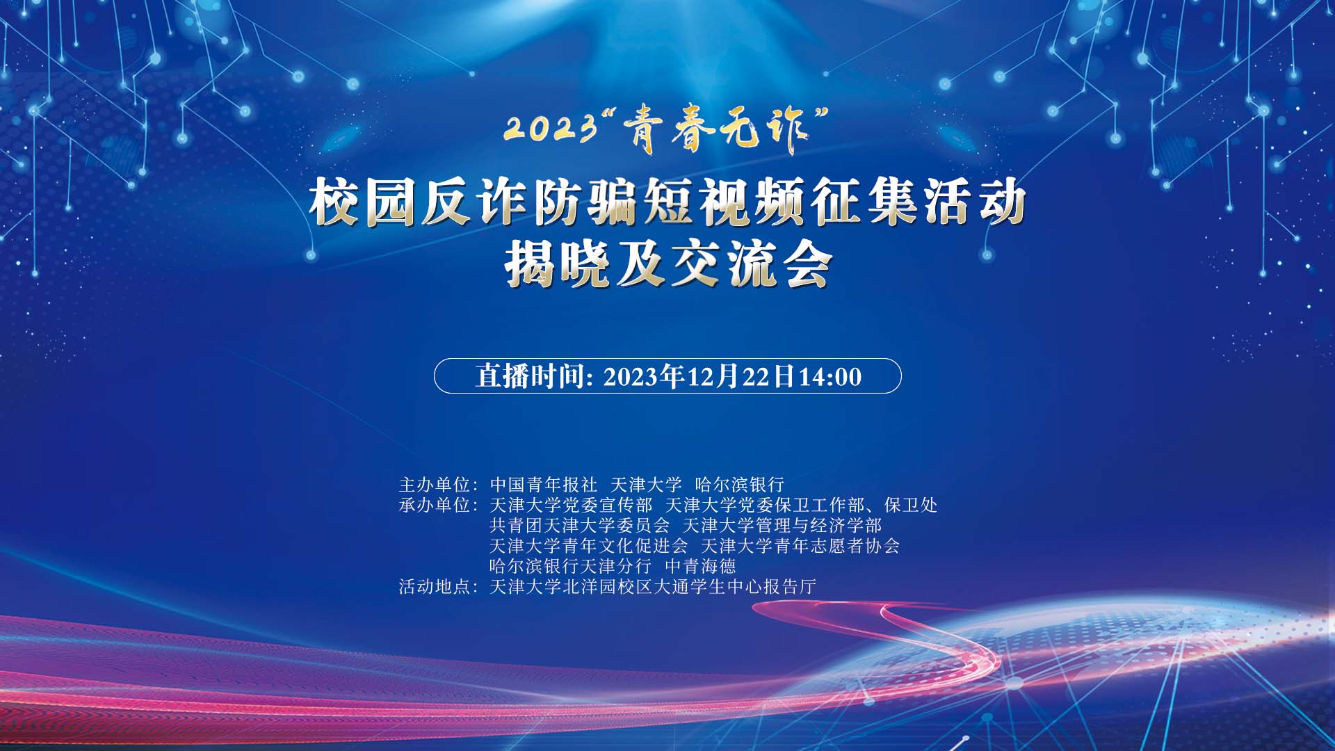 中国青年报客户端北京12月21日电(中青报·中青网见习记者陈晓 记者 胡春艳)2023"青春无诈"校园反诈防骗短视频征集活动揭晓及交流会将于12月22日在天津大学举办。届时,中国青年报社将联合天津大学、哈尔滨银行等单位共同邀请入围作品的创作者和相关专家参加,展示"青春无诈"优秀短视频作品,交流平安校园建设经验,点评反诈防骗典型案例,分享新媒体创作心得,助力平安校园建设。