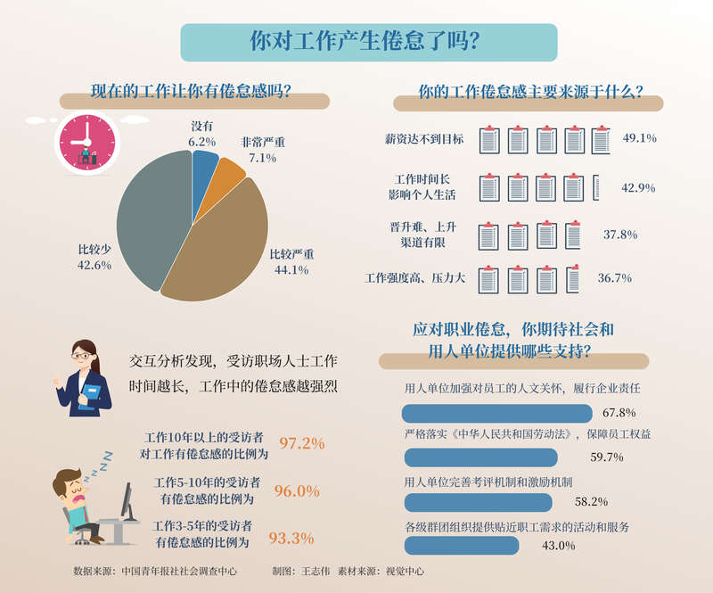 “上班没心情”“工作没动力”……如今不少人感慨,工作久了总觉得很疲倦,逐渐成了“上班困难户”。上周,中国青年报社社会调查中心联合问卷网(wenjuan.com),对1000名职场人士进行的一项调查显示,93.8%的受访者对工作有倦怠感,薪资达不到目标、工作时间长是受访职场人士产生倦怠的主要原因。应对职业倦怠,67.8%的受访职场人士期待用人单位加强对员工的人文关怀,履行企业责任,59.7%的受访职场人士认为要严格落实《中华人民共和国劳动法》,保障员工的各项基本权益。