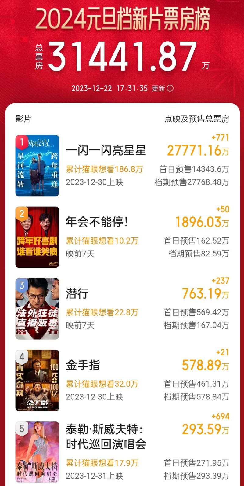 即将到来的元旦档,《一闪一闪亮星星》《金手指》《非诚勿扰3》《年会不能停》等影片将相继上映。目前,该档期预售已突破3亿元。