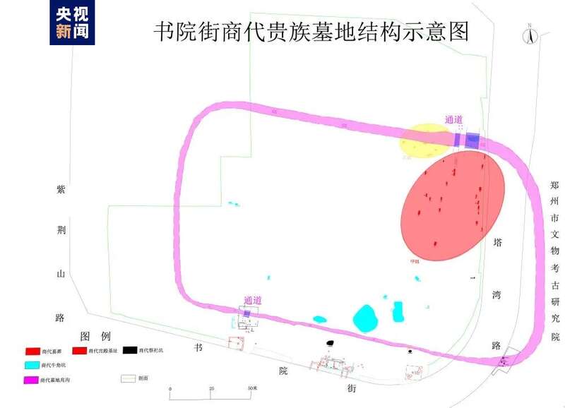 兆域,指墓地四周的疆界,据郑州市文物考古研究院研究员、考古发掘现场负责人黄富成介绍,2021年至2023年,考古人员持续在郑州商都遗址书院街区域开展工作,发现一处商代中期的高等级贵族墓地。该大型墓地距今约3400年,现存面积约2万平方米,由兆沟、出入墓地的通道、墓葬、祭祀遗存等组成,结构清晰,功能明确,具有兆域的整体性、系统性。