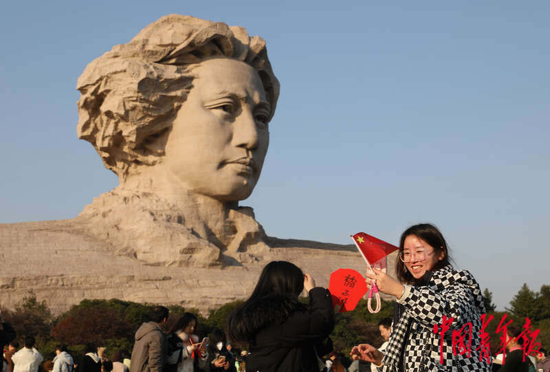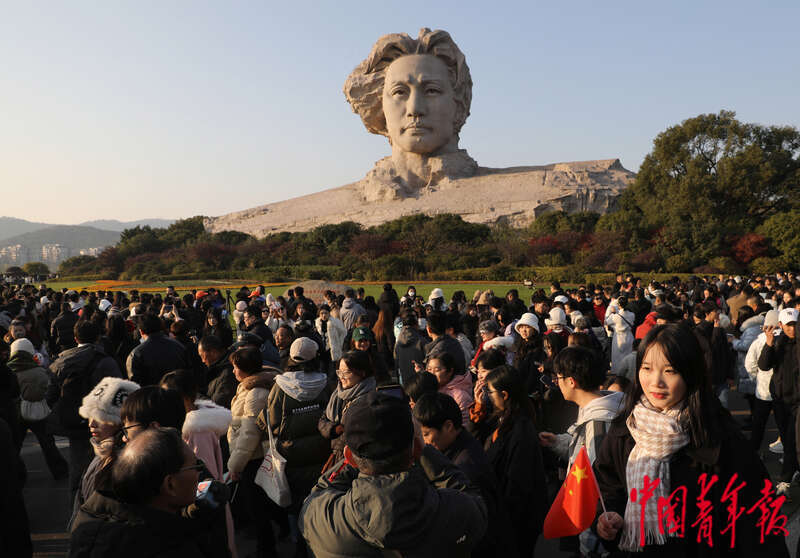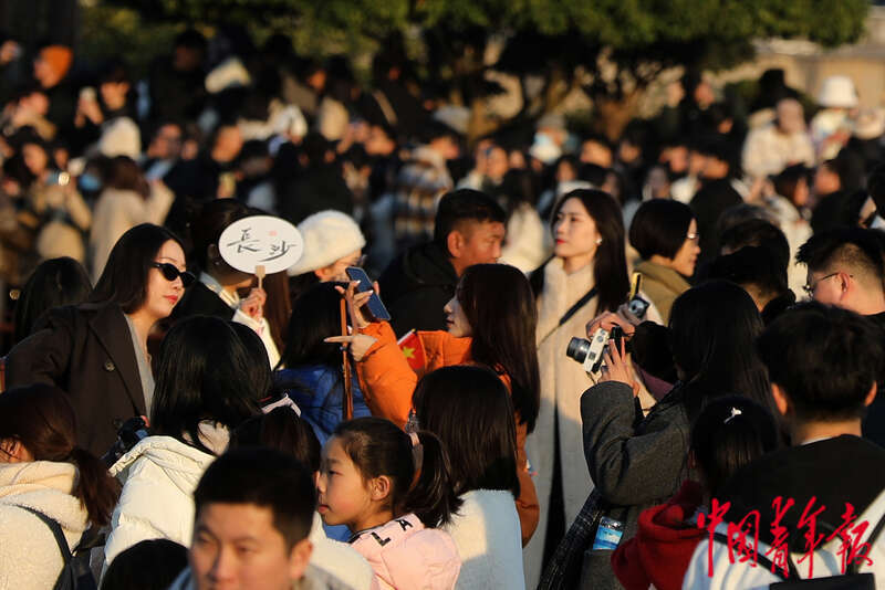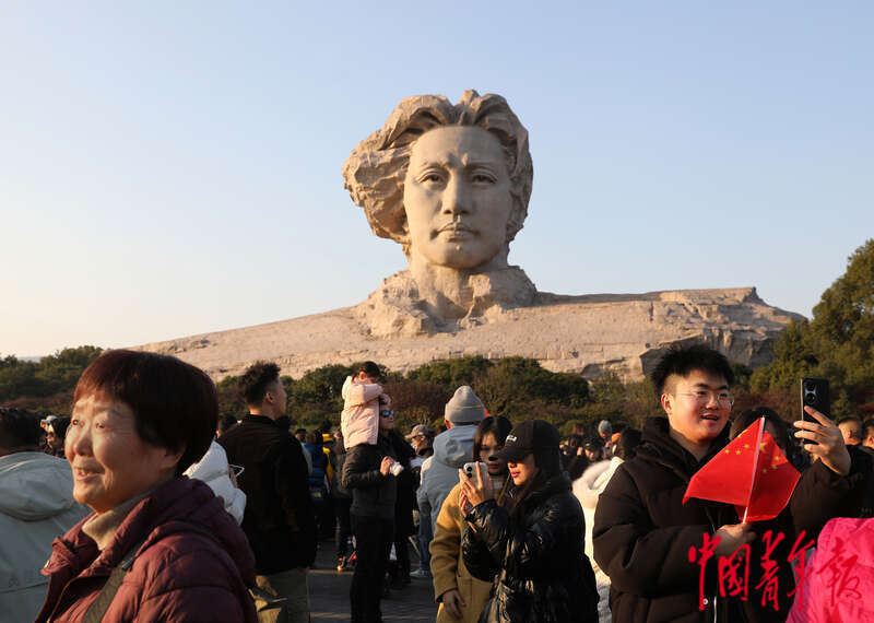12月23日,湖南长沙,橘子洲头游人如织,人们举起国旗在毛泽东青年艺术雕塑前拍照留念。中青报·中青网记者 陈剑/摄