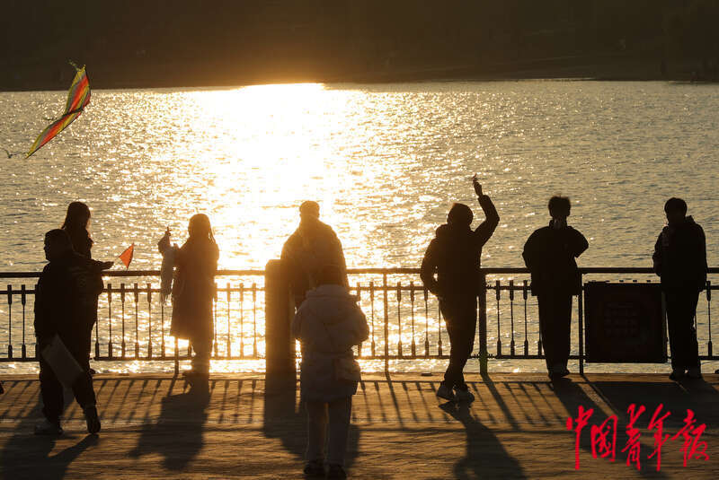12月23日,湖南长沙橘子洲头,游人在湘江边放风筝。中青报·中青网记者 陈剑/摄