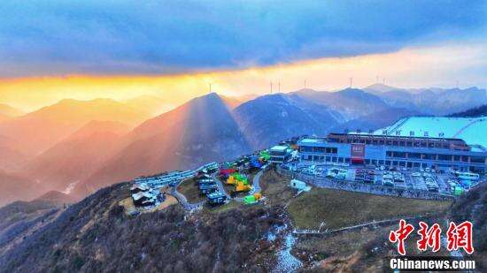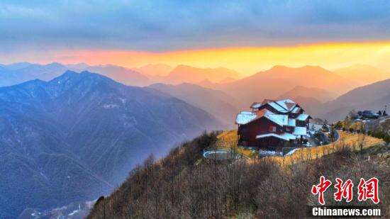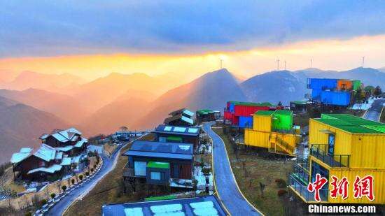 12月23日傍晚,在湖北省五峰土家族自治县海拔2252米的独岭,落日余晖下出现“丁达尔晚霞”美景,云朵和高山民宿在霞光里呈现出梦幻的颜色。