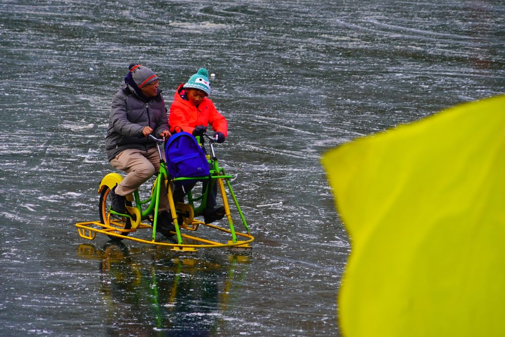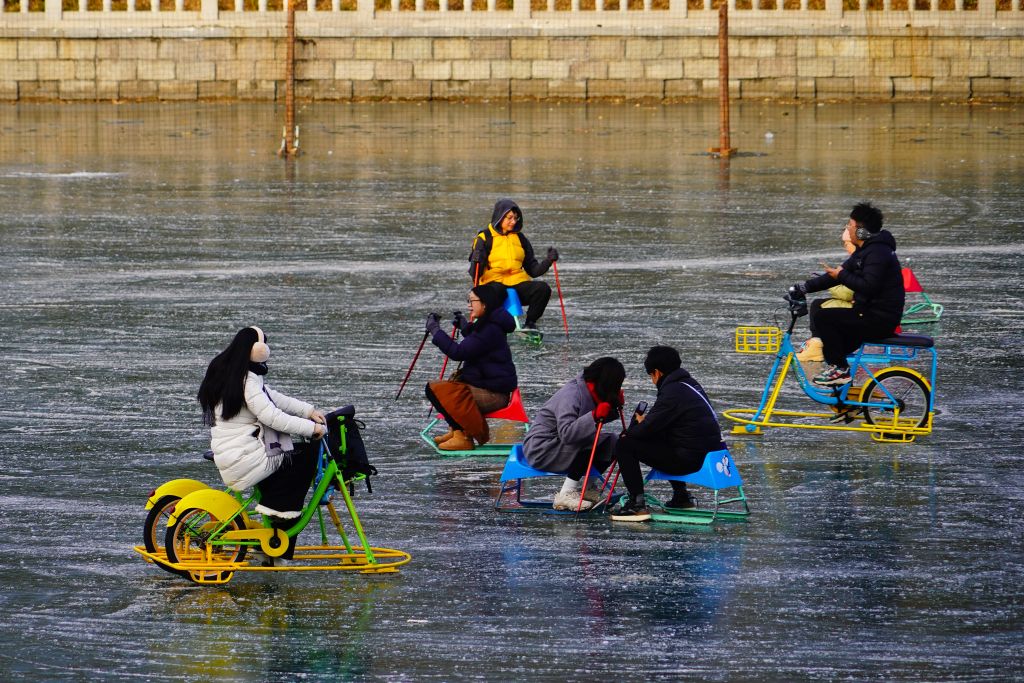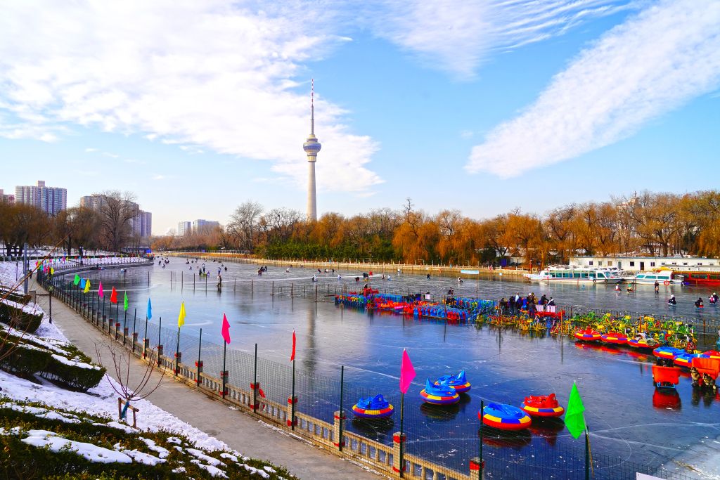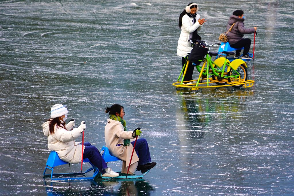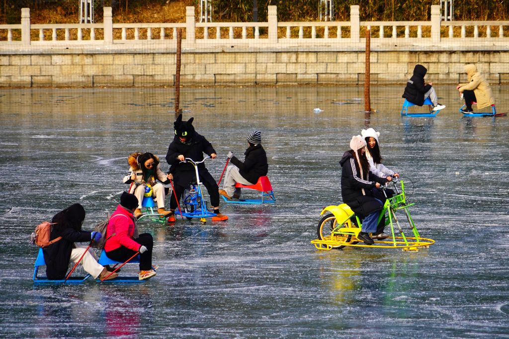 2023年12月25日,北京,市民在八一湖冰场上滑冰,享受冬天的惬意。冰场设置有教学区、滑冰练习区、专业滑冰区、冰车区及电动娱乐区,成为市民冬季冰雪游乐新天地。