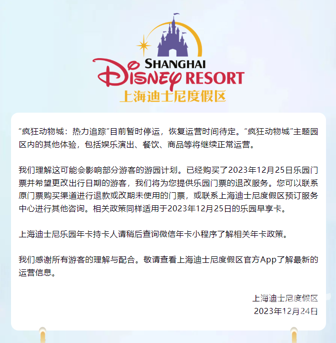 随后,上海迪士尼再发公告称项目暂停,且当日入园游客可获得补偿门票,在2024年1月2日至6月30日期间内选择一天重返乐园体验。