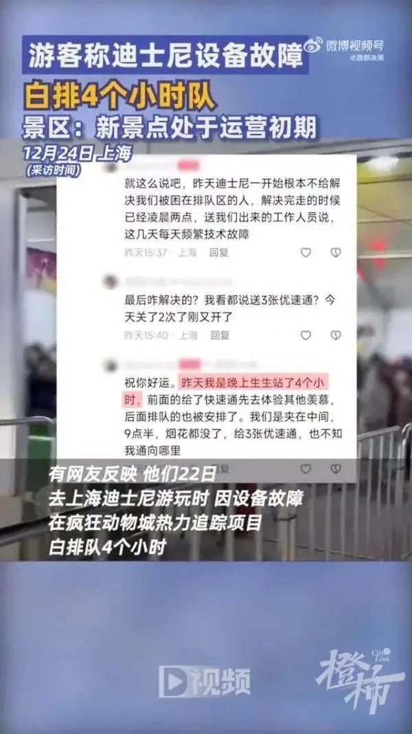有网友反映,他们22日去迪士尼游玩时,因设备故障,在疯狂动物城热力追踪项目白排队4小时。