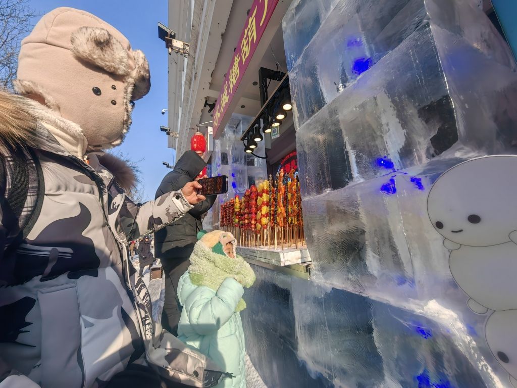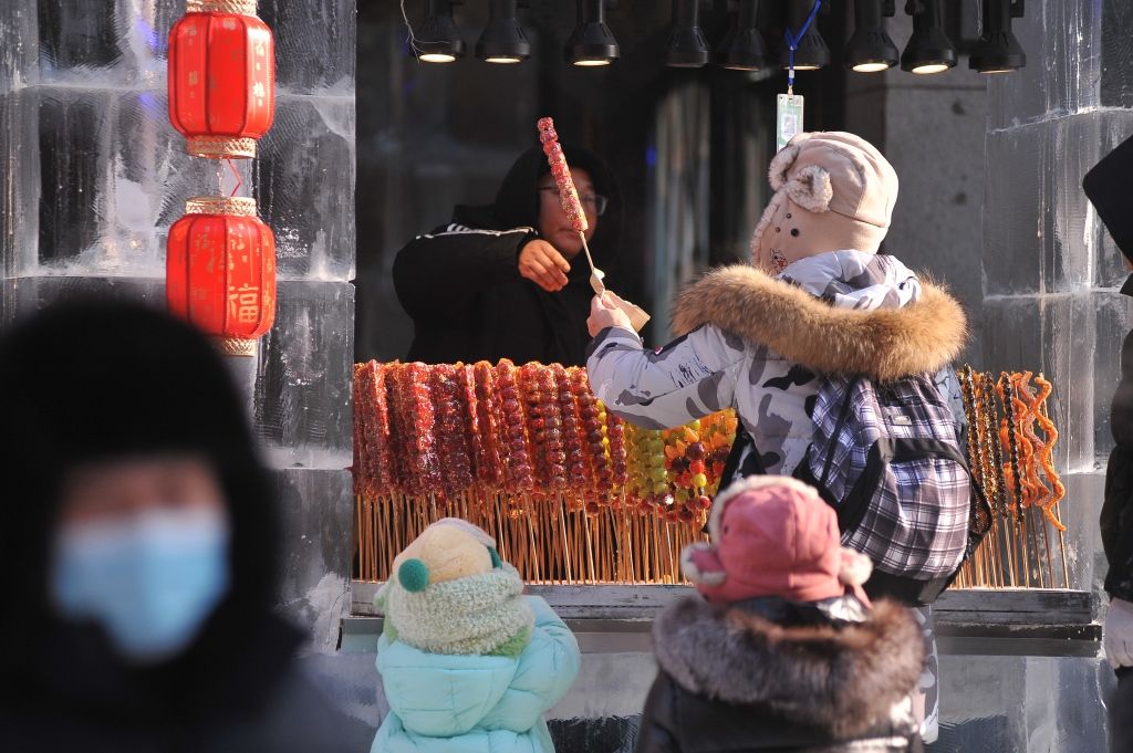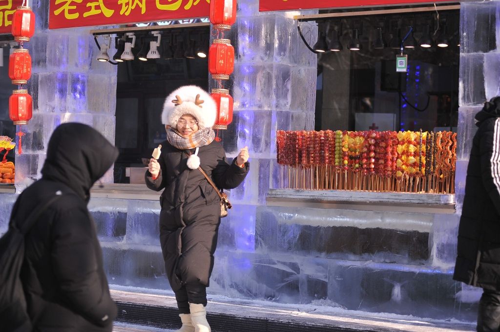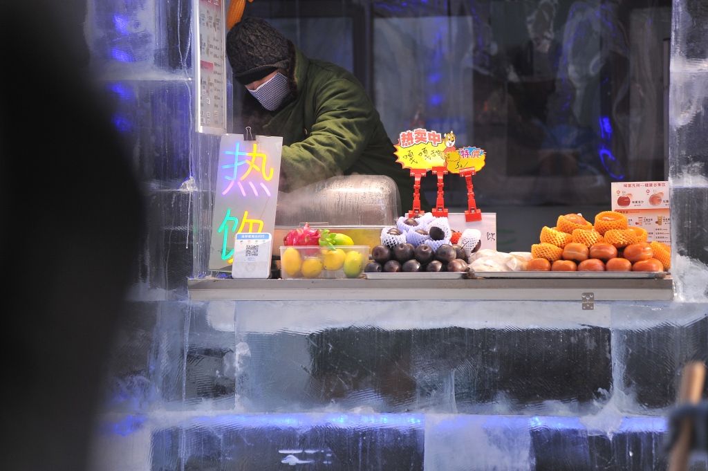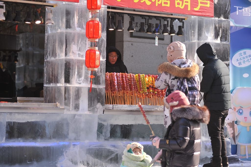 2023年12月26日,哈尔滨,道里区西头道街与中央大街交口,商家打造了多个用冰块堆砌的柜台,上面摆放着冻梨、冻柿子、冰糖葫芦等本地特产和美食,还有冒着热气的关东煮、热饮。