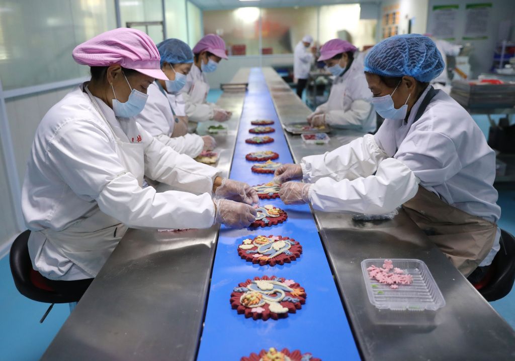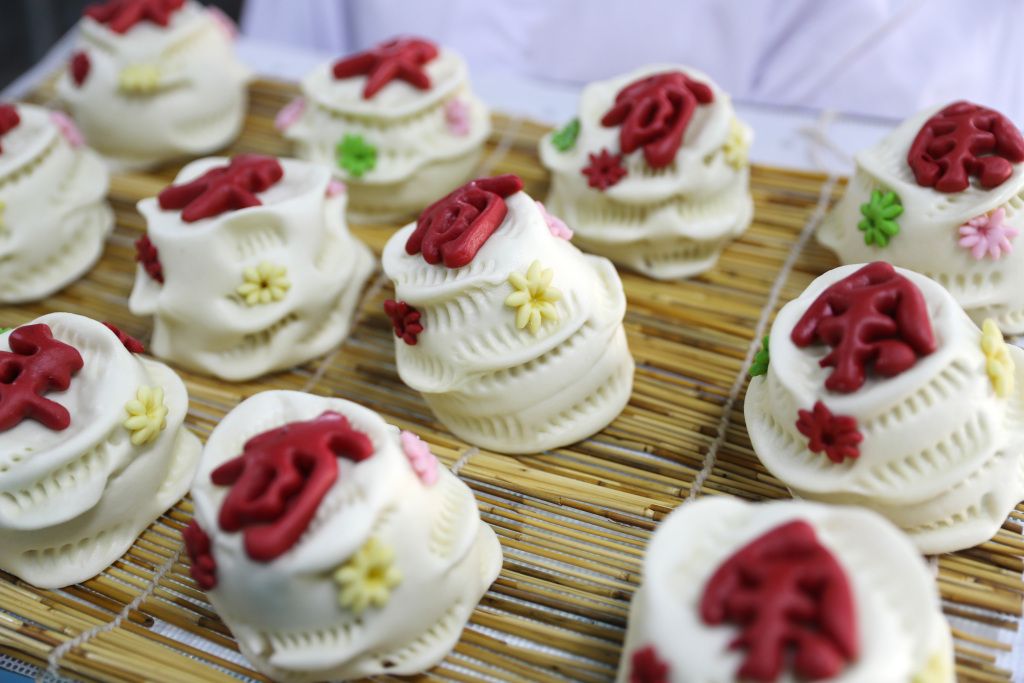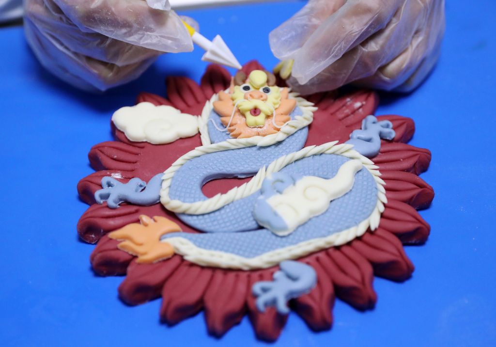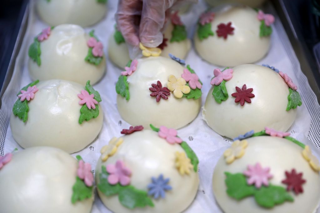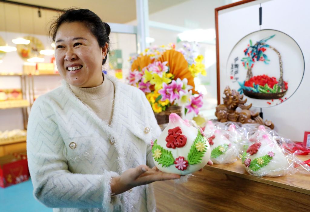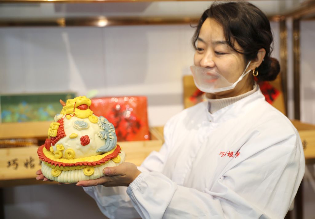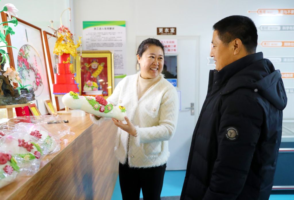 2023年12月24日,青岛,莱西巧姑娘花饽饽的工作人员在摆放刚刚做好的花饽饽。