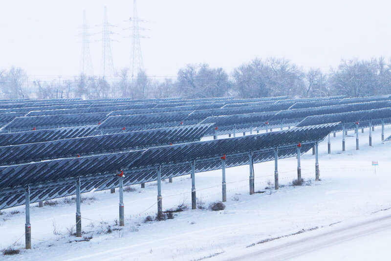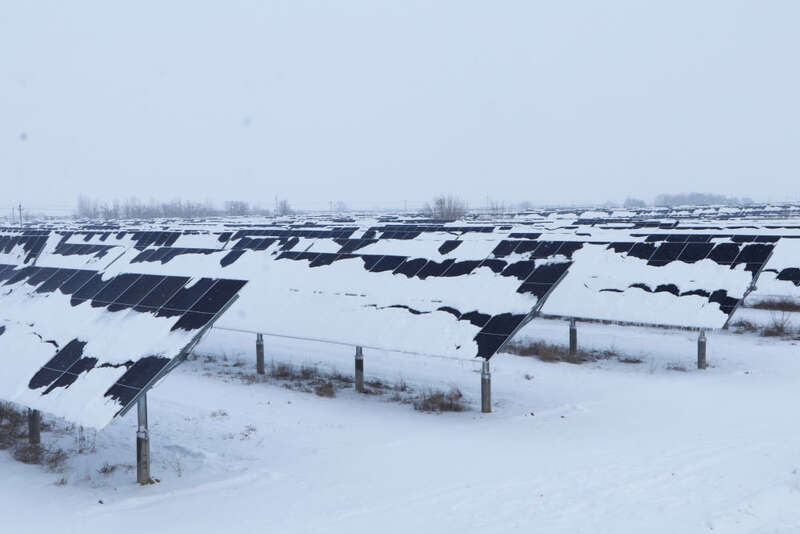 据基地相关负责人王润生介绍,太阳光经雪地、土地漫反射至光伏板背面,一方面太阳能可以转化为电能,另一方面发电过程产生的热量会融化光伏板正面的积雪。“我们基地占地面积达3万多亩,大面积人工清扫效率低,双面双玻光伏板能减少积雪覆盖,能有效提高雪天发电效率。”