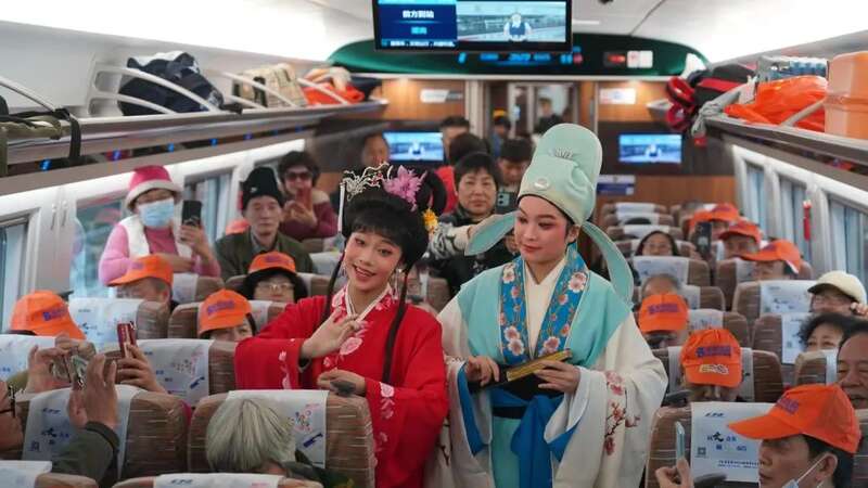 除此之外,路途中还有潮剧小演员在车厢内为旅客们带来了一小段潮剧表演,他们响亮而又悠扬的歌声,惹得车内所有观众鼓掌叫好。