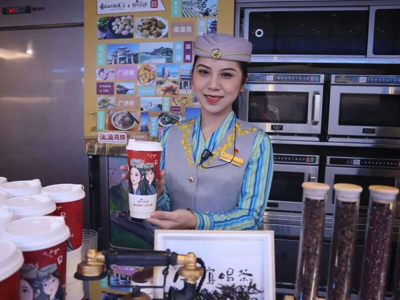 当列车正式启动的那一刻,车内车外的人们,纷纷拿起手机或专业的摄影设备,记录下这令人难以忘怀的时刻,萌主也不例外。列车正以最高时速按350公里运营,车内也正热闹着。令萌主印象深刻的是,列车上的特色餐饮台有各色“潮汕美食”,如有潮汕单枞茶、潮汕味卤鸭翅、猪肉脯、牛肉脯,“那个女孩”高铁奶茶等,香味和美味都让人恋恋不忘。