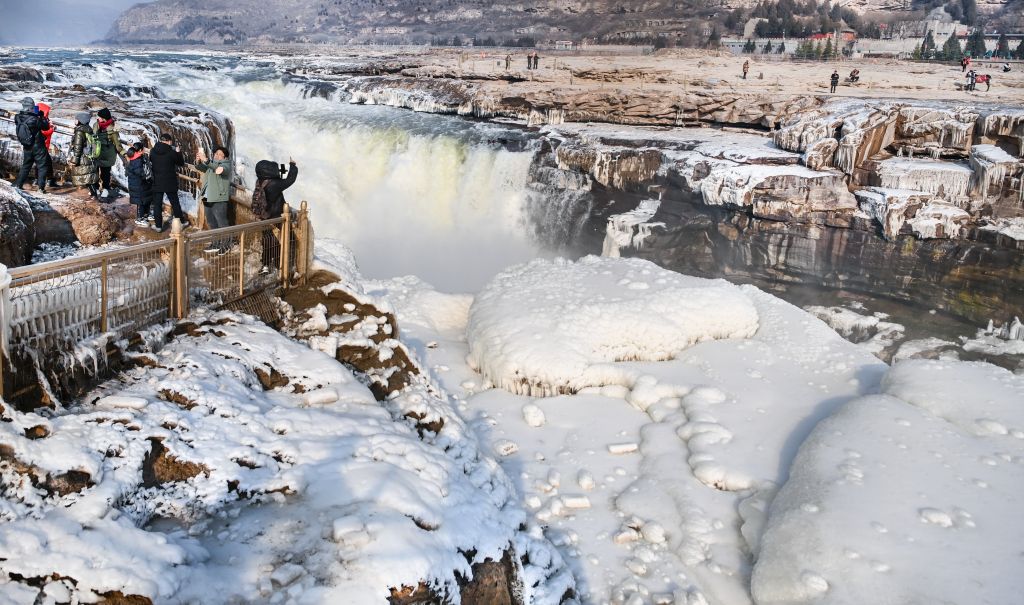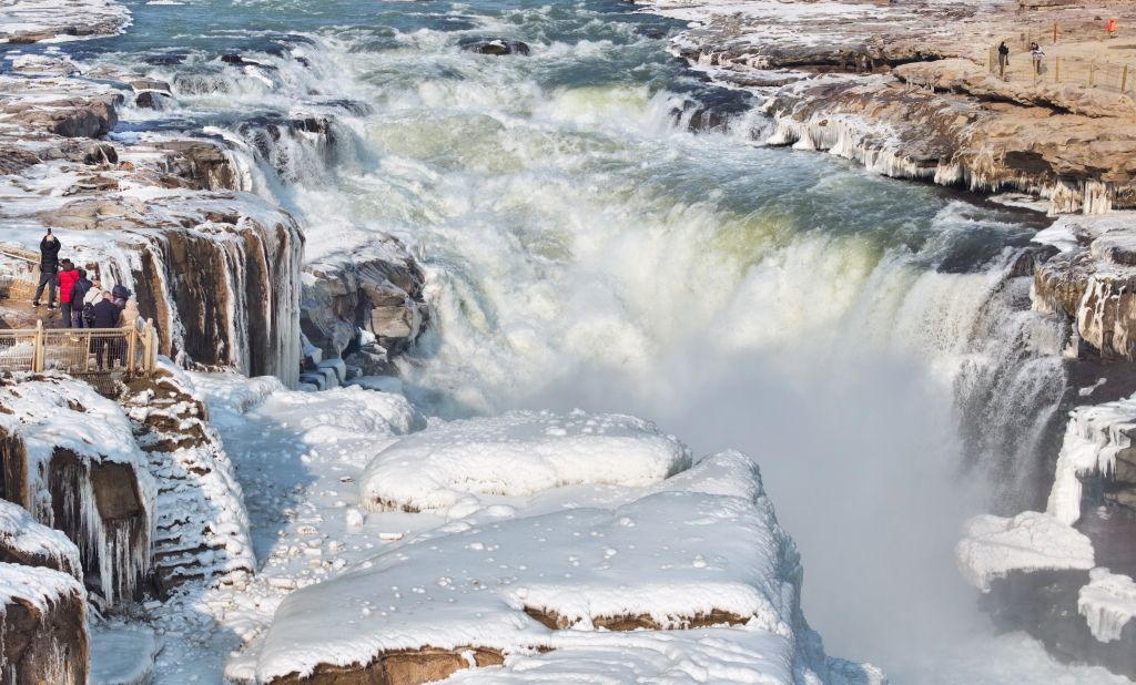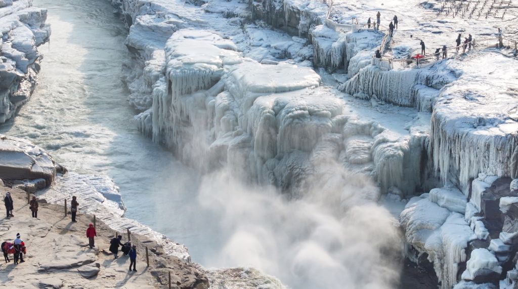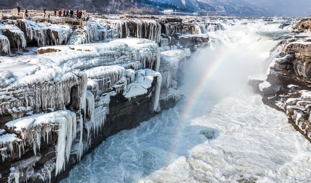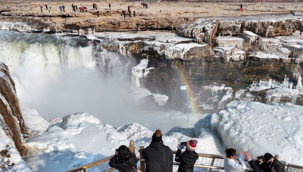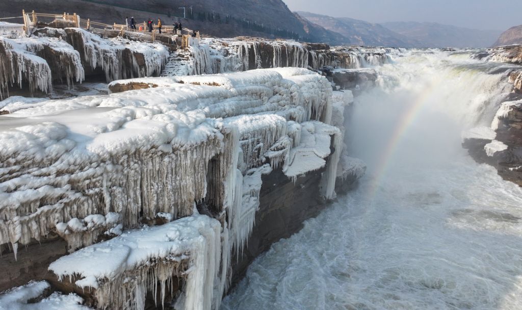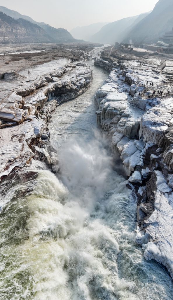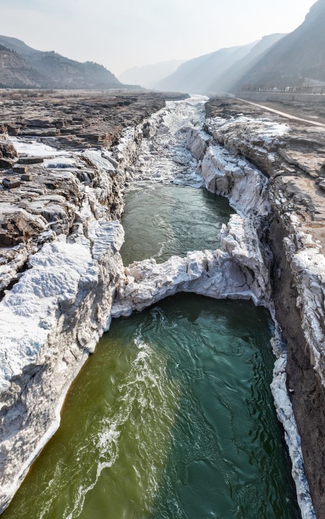 2024年元旦前夕,随着气温回暖,位于秦晋大峡谷的黄河壶口瀑布河道冰层断裂,瀑布水流落差增大,气势恢弘。从空中俯瞰,此时的黄河水由浑变清,湍急的河水奔腾而下,跌入深潭,不断冲刷着冰层,形成天然“冰桥”,与清澈的瀑布交相辉映,呈现出“冰桥清瀑”壮美奇景。