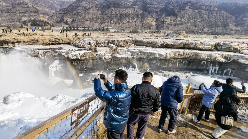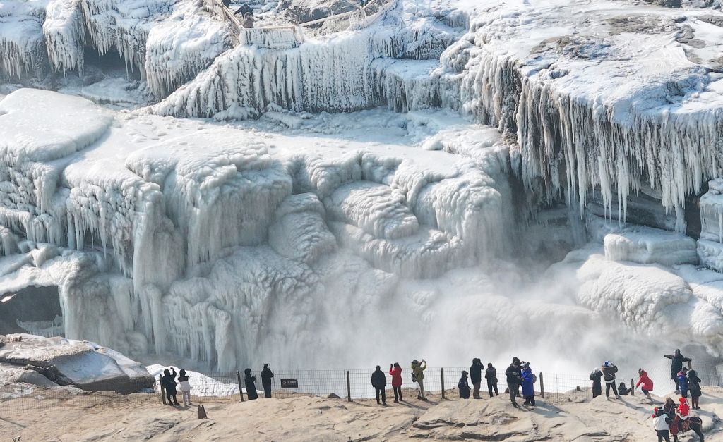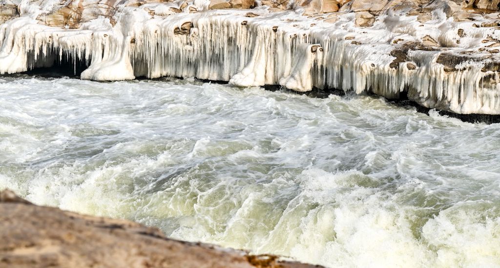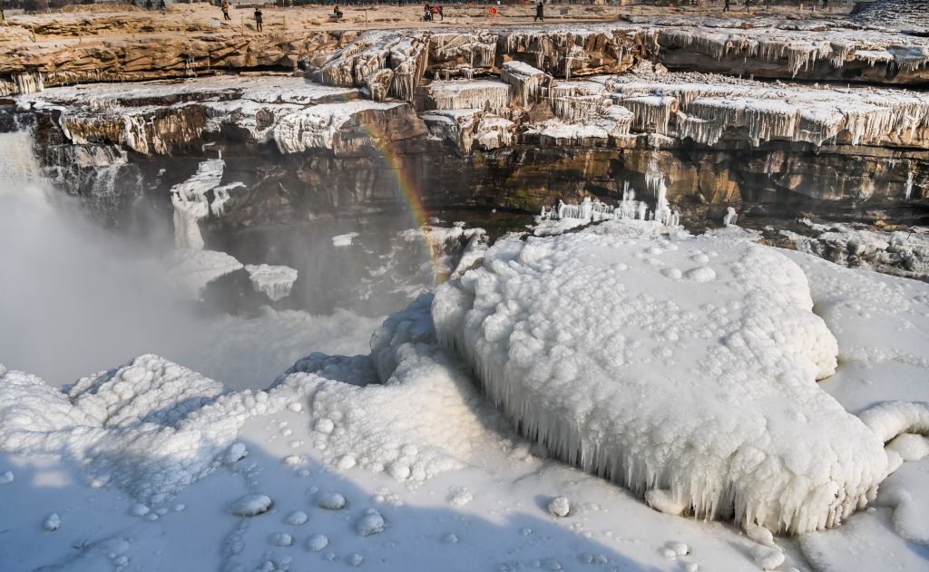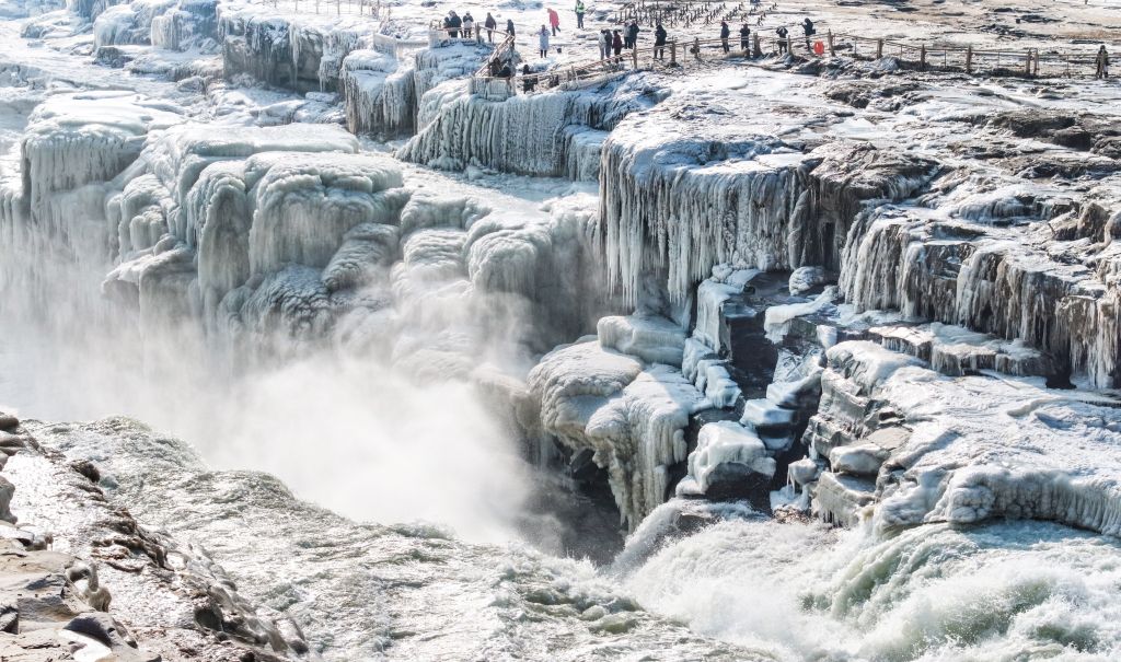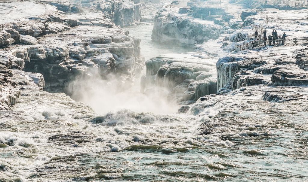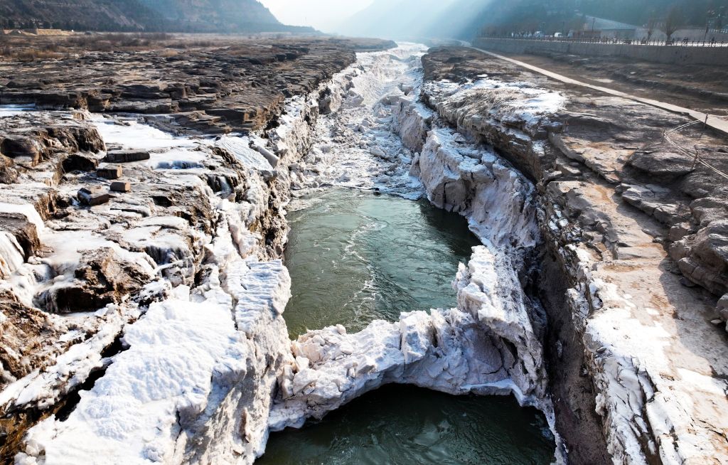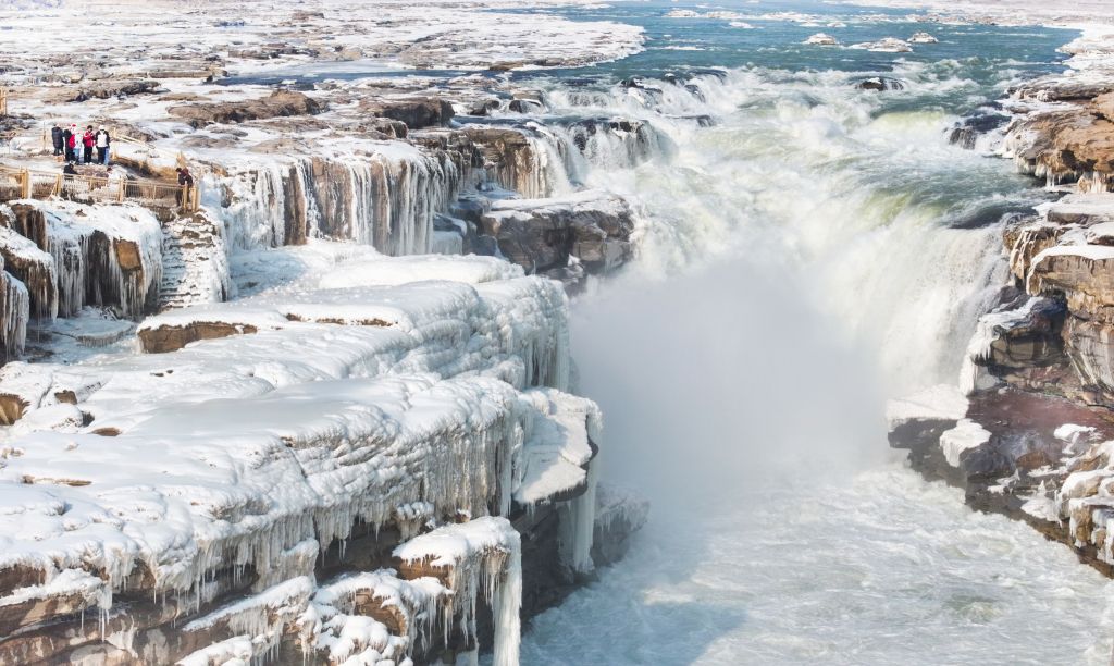 2024年元旦前夕,随着气温回暖,位于秦晋大峡谷的黄河壶口瀑布河道冰层断裂,瀑布水流落差增大,气势恢弘。从空中俯瞰,此时的黄河水由浑变清,湍急的河水奔腾而下,跌入深潭,不断冲刷着冰层,形成天然“冰桥”,与清澈的瀑布交相辉映,呈现出“冰桥清瀑”壮美奇景。