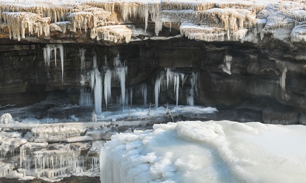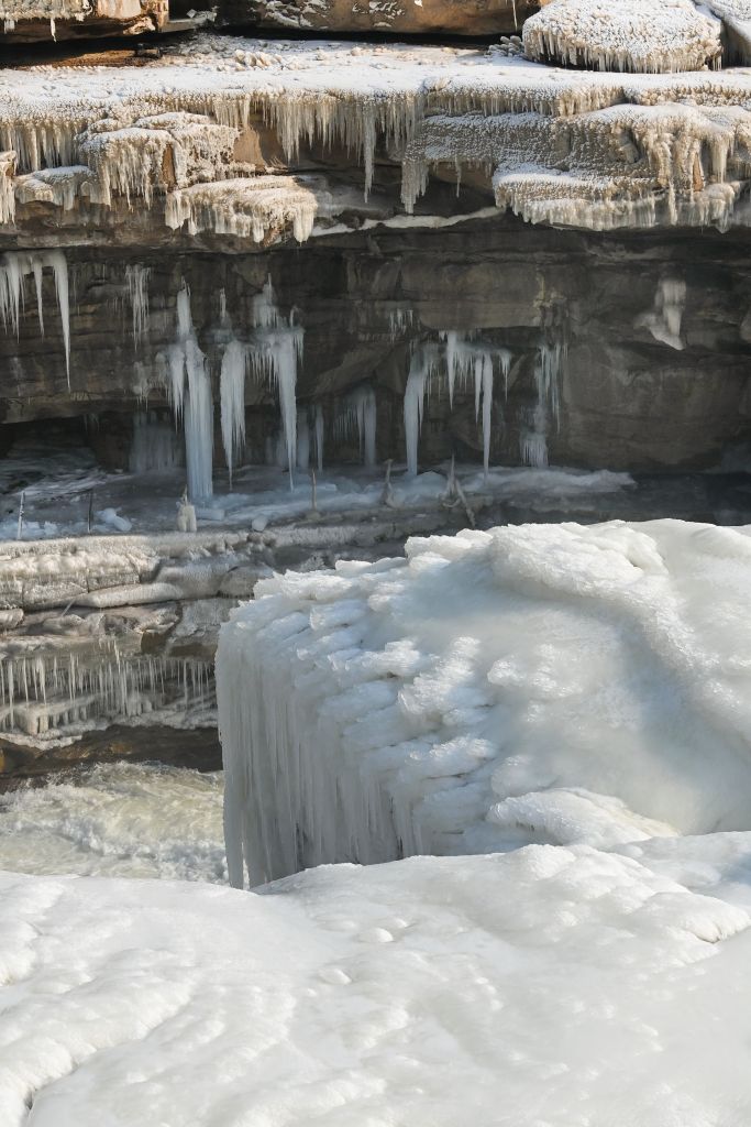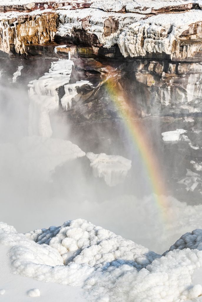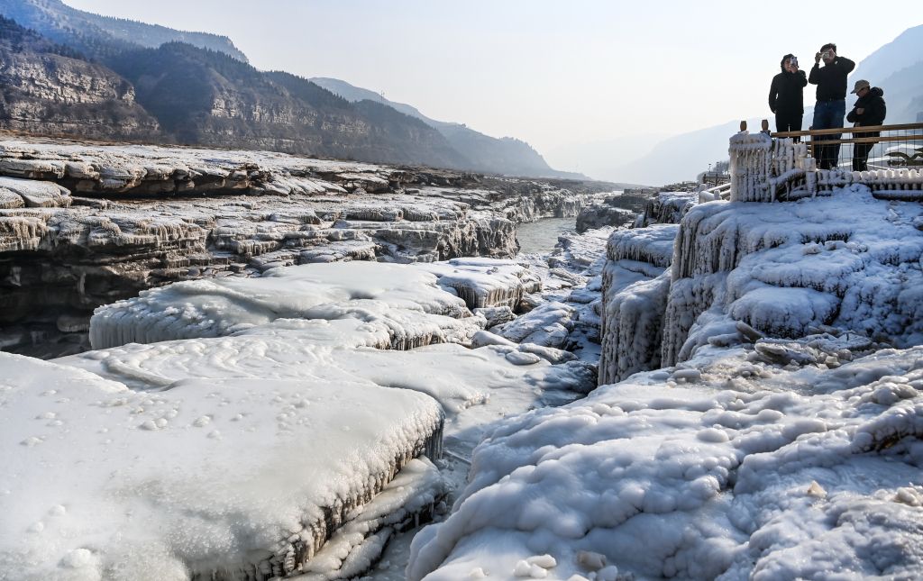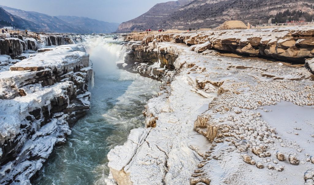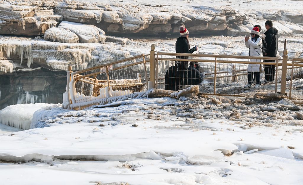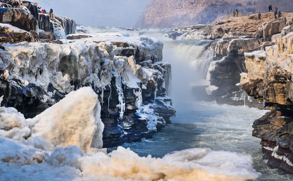 2024年元旦前夕,随着气温回暖,位于秦晋大峡谷的黄河壶口瀑布河道冰层断裂,瀑布水流落差增大,气势恢弘。从空中俯瞰,此时的黄河水由浑变清,湍急的河水奔腾而下,跌入深潭,不断冲刷着冰层,形成天然“冰桥”,与清澈的瀑布交相辉映,呈现出“冰桥清瀑”壮美奇景。