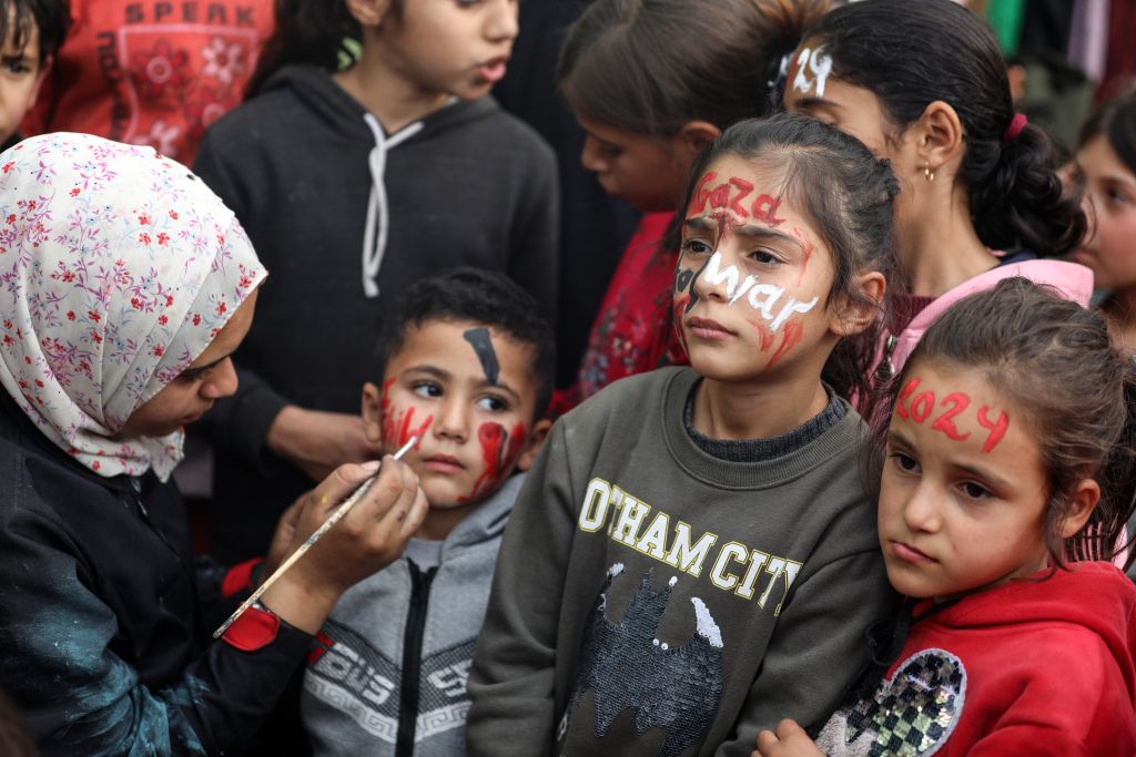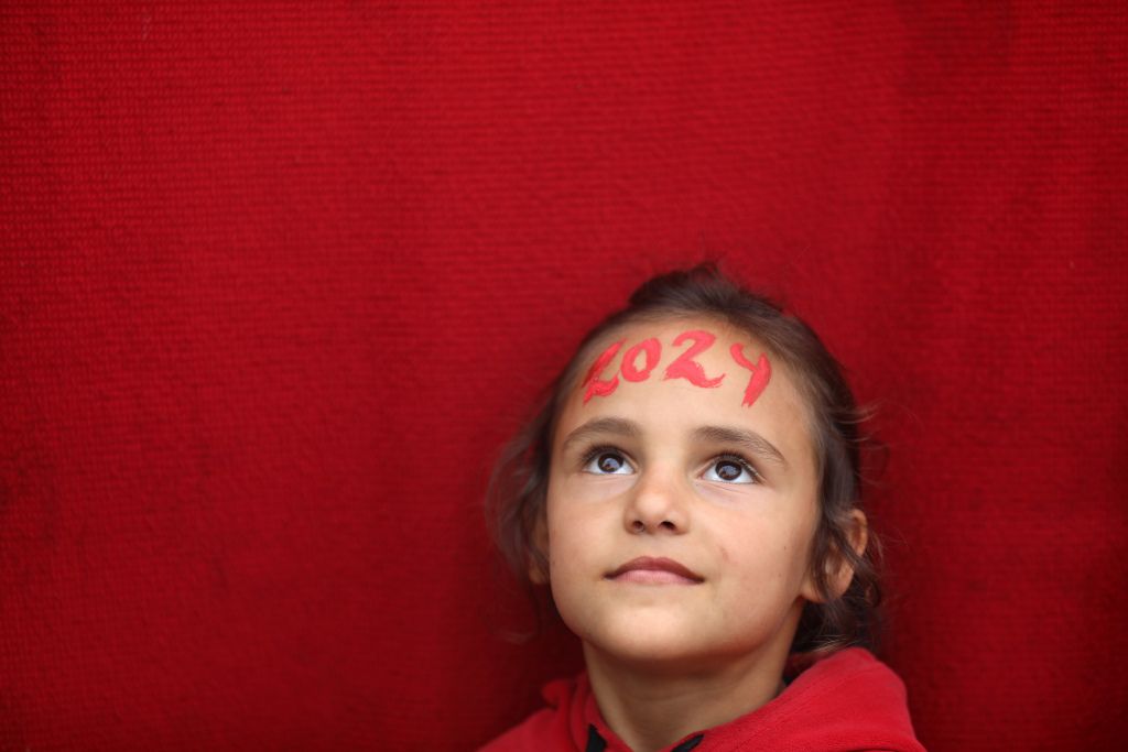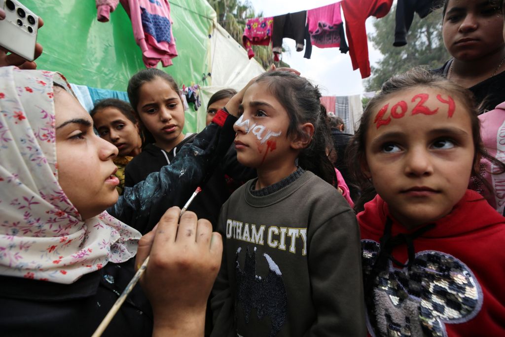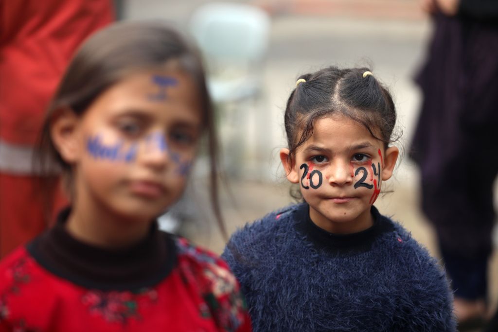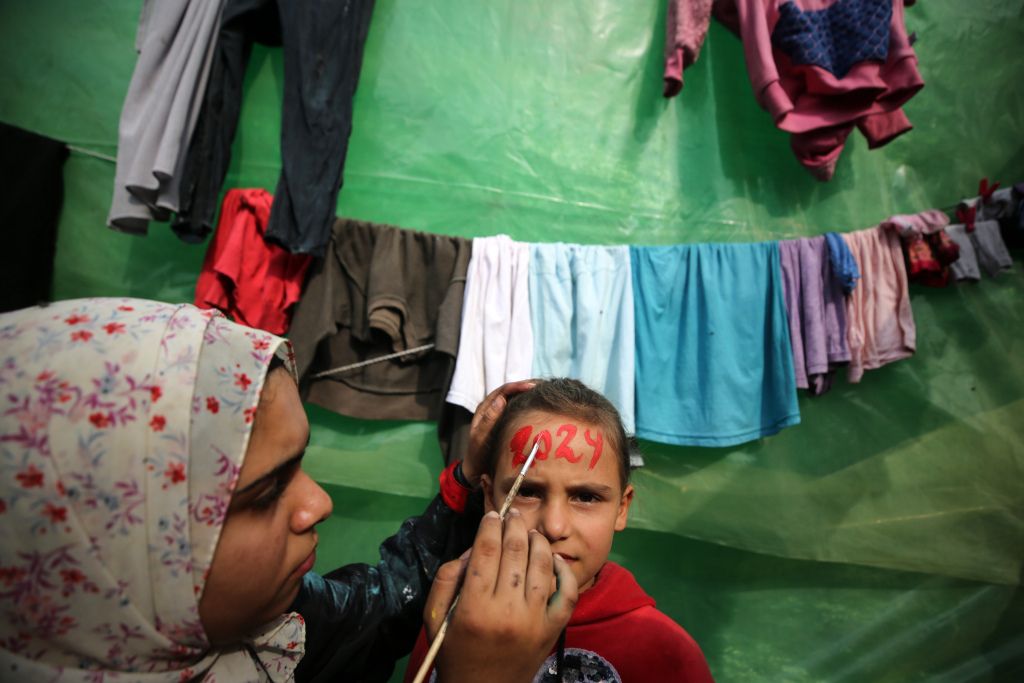当地时间2023年12月27日,加沙地带代尔拜拉赫,巴以冲突持续,在新年庆祝活动之前,20岁的巴勒斯坦艺术家Menna Allah Hamouda在一所近东救济工程处学校里,为流离失所的孩子们在脸上画上“2024”的字样。
