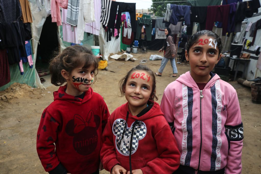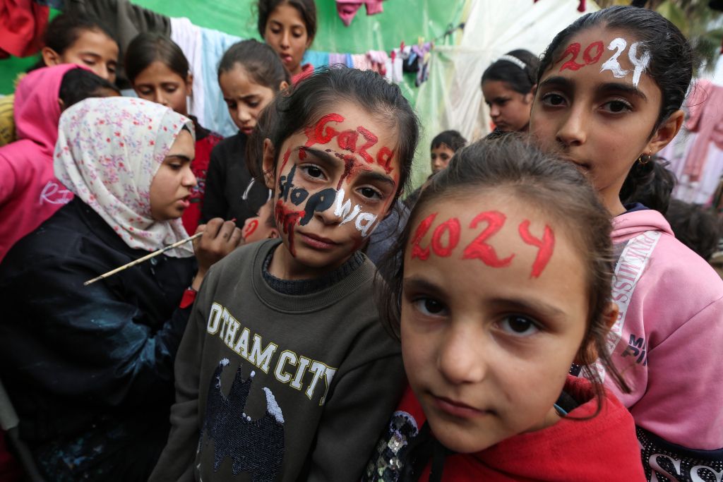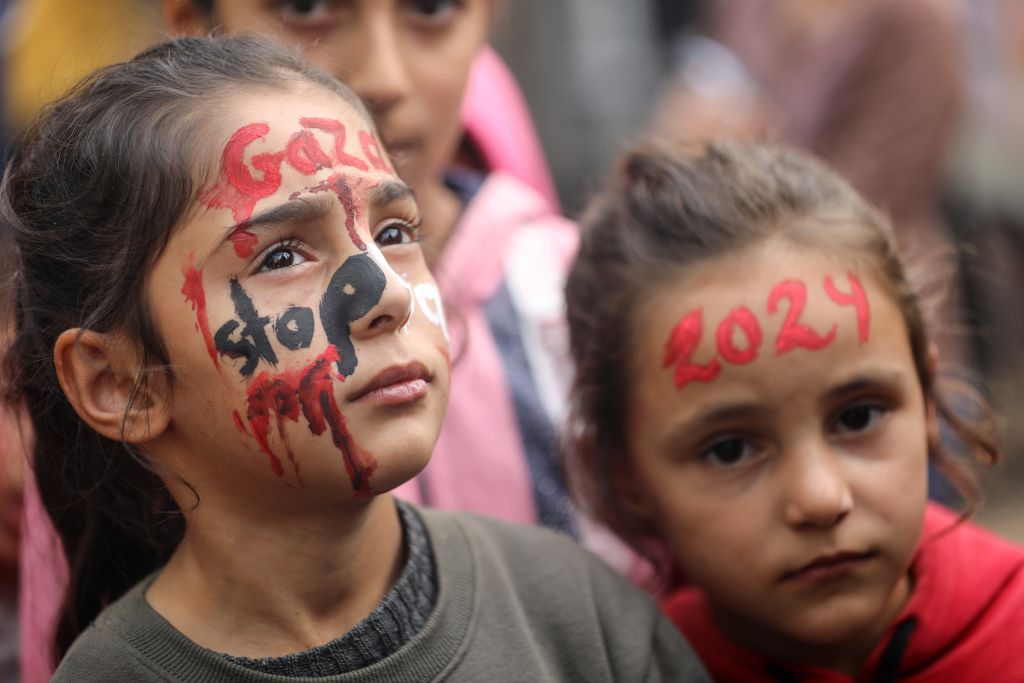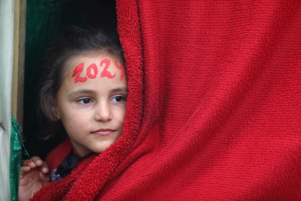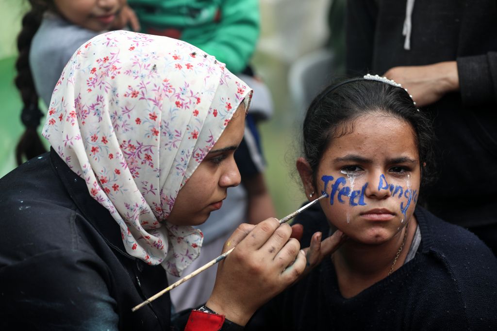当地时间2023年12月27日,加沙地带代尔拜拉赫,巴以冲突持续,在新年庆祝活动之前,20岁的巴勒斯坦艺术家Menna Allah Hamouda在一所近东救济工程处学校里,为流离失所的孩子们在脸上画上“2024”的字样。