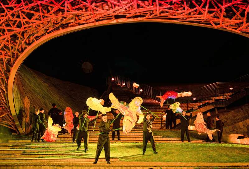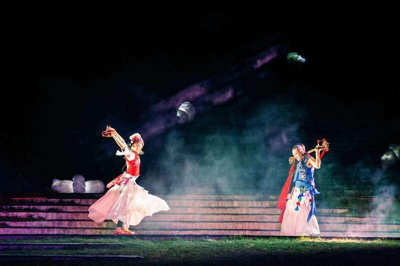 以苍山为背景,在喜洲古镇的大青树下,艺术家通过搭建田野舞台,配合大地装置艺术品,进行了“舞者的乡愁”大理民间歌舞集和“风花雪月云”经典舞台舞蹈艺术两场演出,观众置身其中,沉浸式跟随着舞者的步伐,在体验中成为艺术的共创者,两场表演诠释出“环境舞蹈”的魅力。