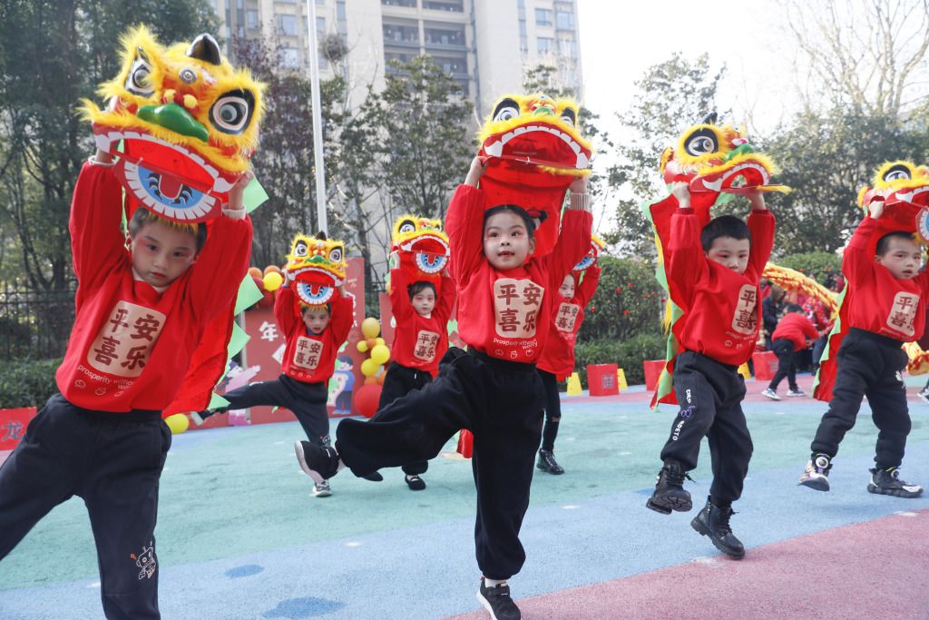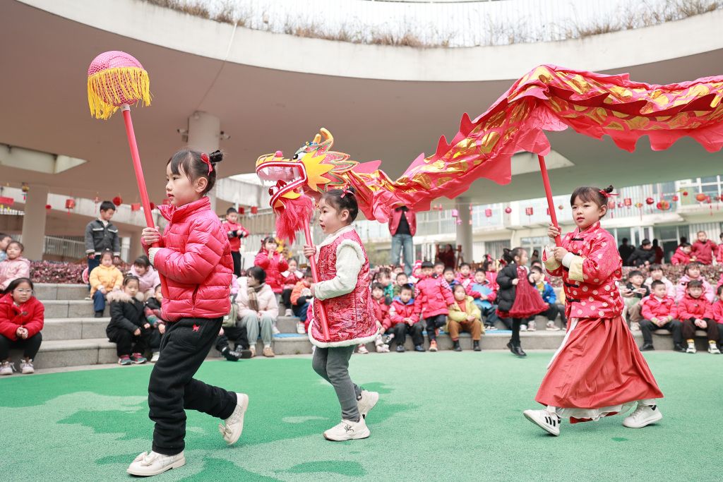 2023年12月29日,浙江湖州,长兴县龙山街道中心幼儿园,孩子们在进行舞龙活动迎接新年的到来。