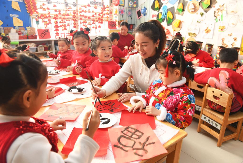 2023年12月29日,河北石家庄,新乐市市直第二幼儿园小朋友们在跟老师学写“福”字。