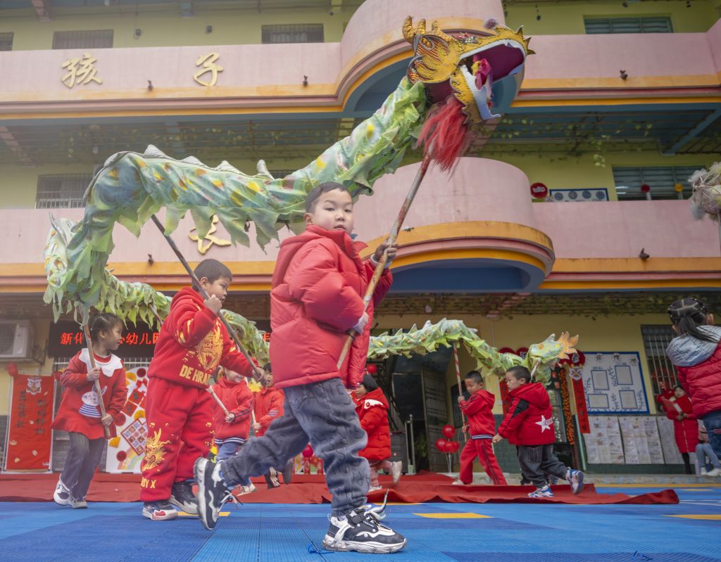 2023年12月29日,贵州黔东南州锦屏县新化乡中心幼儿园,孩子们在园内表演民间舞龙迎新年。