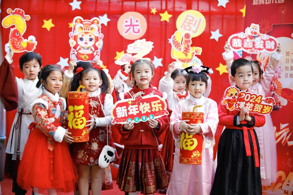 2023年12月29日,福州市,鼓楼区鼓西街道新晖幼儿园,小朋友手持龙年“2024”字样,喜迎新年。