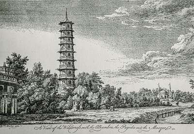 相比之下,英国皇家植物园邱园中的中国宝塔更为接近中国风格。以至于在参观邱园时,我曾一度以为这座宝塔是从中国运来的。宝塔是由当时的英国皇家建筑师威廉·钱伯斯遵循中国建筑范式、以南京大报恩寺琉璃宝塔为原型设计建造的。钱伯斯曾两度到访中国,并在其出版的著作中盛赞中国园林的魅力。邱园建造完工后,钱伯斯同年出版了《邱园中的建筑设计》,直到19世纪初期,邱园中的中式宝塔一直是欧洲时尚建筑设计的原型。