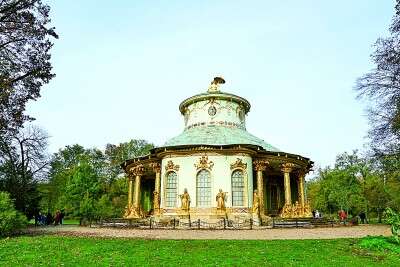 无忧宫是欧洲中国风建筑的代表作。如果来柏林旅游,游客一般都会乘火车到郊外的无忧宫一日游。这座宫殿建于18世纪,由当时的普鲁士国王腓特烈二世下令兴建。整个无忧宫中,除了主殿建筑的雕塑,最引人注目的就是园林中一处名为“中国茶亭”的建筑。虽然名为“中国茶亭”,但是这栋建筑第一眼看上去压根儿不是我们传统意义上的茶亭,有些不伦不类。这是一座圆形的建筑,外形有些像蒙古人伞状盖顶的帐篷。建筑的四周是金色的柱子和镀金的人物雕塑,这些人物除了飘逸的衣衫有点儿中国风,长相依然是高鼻大眼的欧洲人面相。整个茶亭金碧辉煌,与中国传统亭阁的淡雅悠远相去甚远,反倒是旁边放置的一个香鼎是原汁原味的中国风。