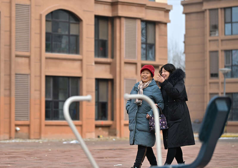 在天津市西青区辛口镇水高庄村,村民王玉华(左)在村干部的陪同下熟悉还迁小区(12月12日摄)。新华社记者 李然 摄