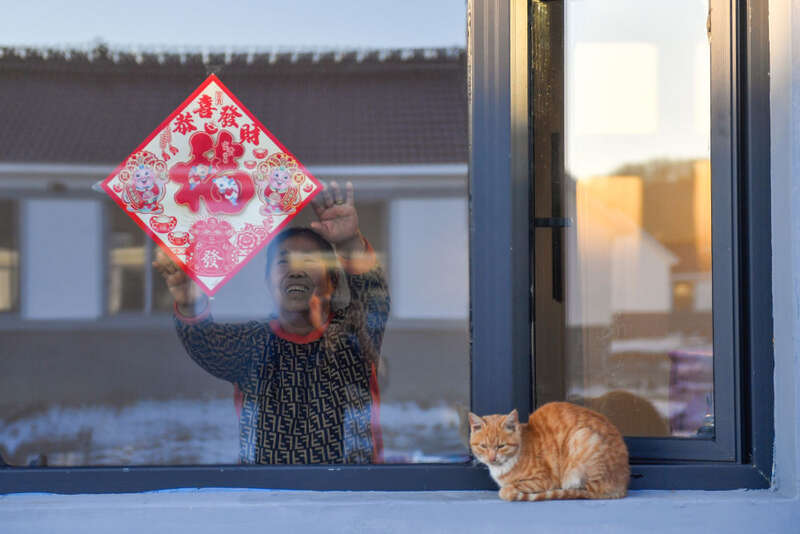 吉林省舒兰市开原镇新开村村民徐中仁在新房子中贴“福”字(12月7日摄)。新华社记者 许畅 摄