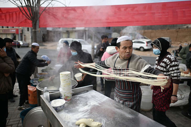 在青海省海东市民和县官亭镇,一家拉面店店主不顾自家在地震中受损的店铺,支起锅灶为乡亲们免费提供拉面。这是店员和附近帮忙的村民在拉面摊上忙碌(12月20日摄)。新华社记者 张宏祥 摄