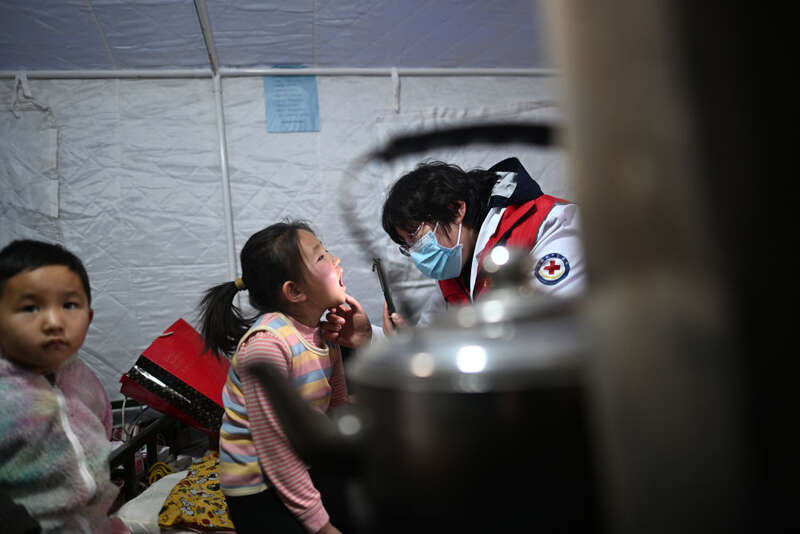 在青海省海东市民和回族土族自治县官亭镇喇家村安置点,山东援青医生李鸿皓(右)为喇生婷检查身体(12月23日摄)。积石山6.2级地震发生以来,在青海省海东市民和回族土族自治县,当地医疗机构和援青医疗队通过设立医疗点、开展巡诊等方式保障安置点群众就医服务,守护群众健康。新华社记者 张宏祥 摄